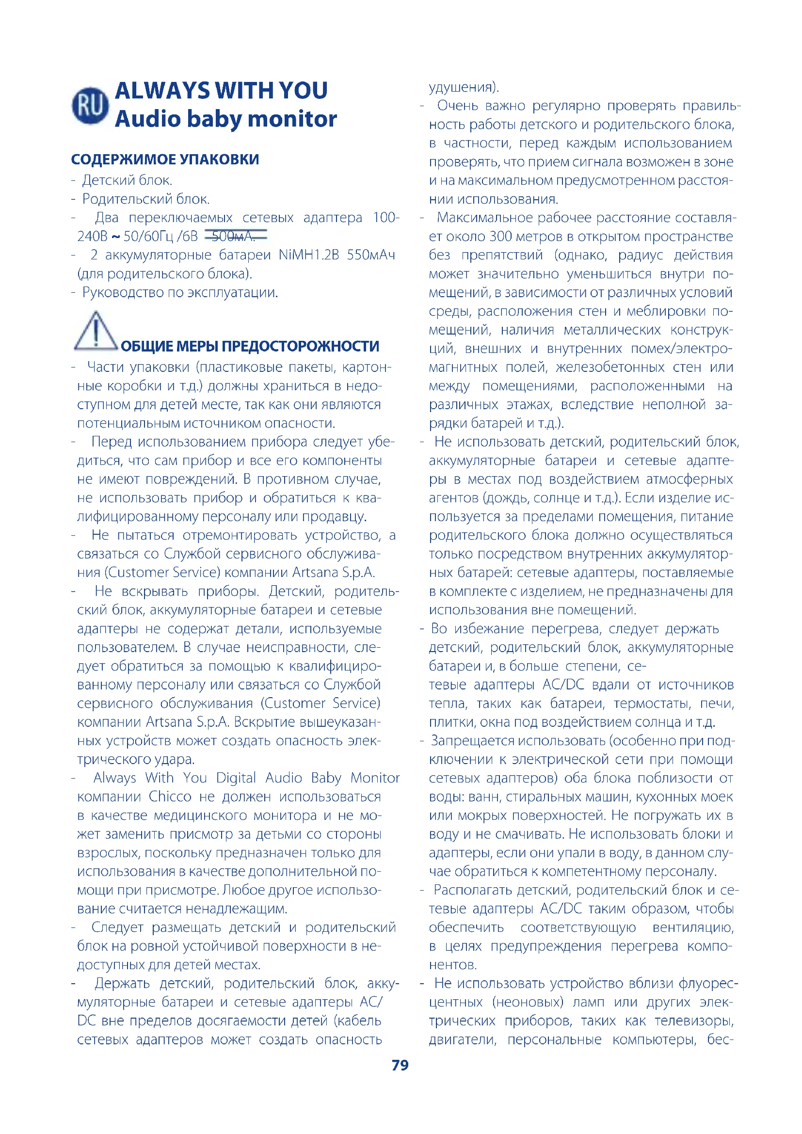 Audio baby monitor СОДЕРЖИМОЕ УПАКОВКИ - Детский блок. - Родительский блок. - Два переключаемых сетевых адаптера 100- 240В ~ 50/60Гц /6В 500мA. - 2 аккумуляторные батареи NiMH1.2В 550мАч (для родительского блока). - Руководство по эксплуатации. ОБЩИЕ МЕРЫ ПРЕДОСТОРОЖНОСТИ - Части упаковки (пластиковые пакеты, картон- ные коробки и т.д.) должны храниться в недо- ступном для детей месте, так как они являются потенциальным источником опасности. - Перед использованием прибора следует убе- диться, что сам прибор и все его компоненты не имеют повреждений. В противном случае, не использовать прибор и обратиться к ква- лифицированному персоналу или продавцу. - Не пытаться отремонтировать устройство, а связаться со Службой сервисного обслужива- ния (Customer Service) компании Artsana S.p.A. - Не вскрывать приборы. Детский, родитель- ский блок, аккумуляторные батареи и сетевые адаптеры не содержат детали, используемые пользователем. В случае неисправности, сле- дует обратиться за помощью к квалифициро- ванному персоналу или связаться со Службой сервисного обслуживания (Customer Service) компании Artsana S.p.A. Вскрытие вышеуказан- ных устройств может создать опасность элек- трического удара. - Always With You Digital Audio Baby Monitor компании Chicco не должен использоваться в качестве медицинского монитора и не мо- жет заменить присмотр за детьми со стороны взрослых, поскольку предназначен только для использования в качестве дополнительной по- мощи при присмотре. Любое другое использо- вание считается ненадлежащим. - Следует размещать детский и родительский блок на ровной устойчивой поверхности в не- доступных для детей местах. - Держать детский, родительский блок, акку- муляторные батареи и сетевые адаптеры AC/ DC вне пределов досягаемости детей (кабель сетевых адаптеров может создать опасность