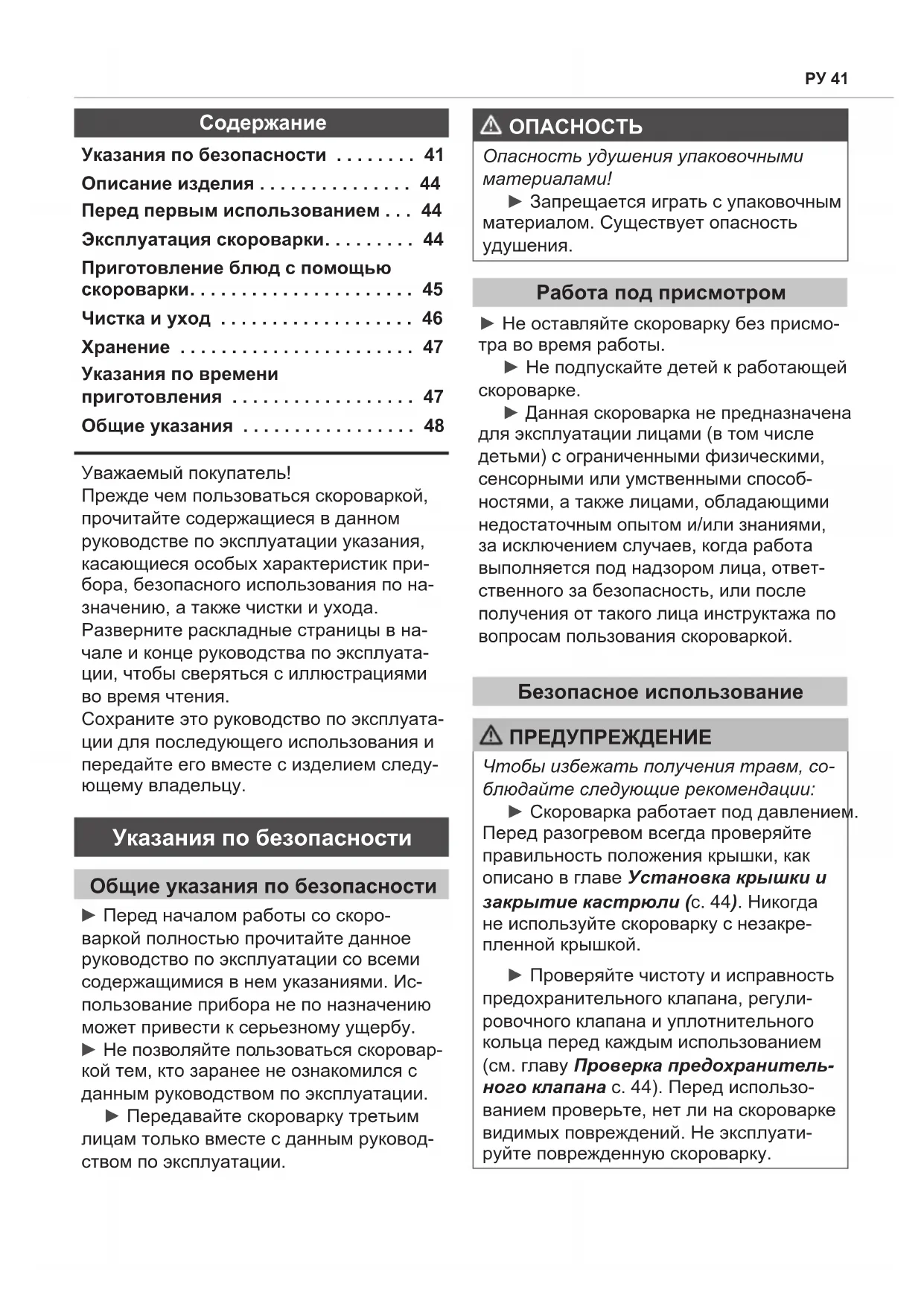 Чтобы избежать получения травм, со- блюдайте следующие рекомендации: ► Скороварка работает под давлением. Перед разогревом всегда проверяйте правильность положения крышки, как описано в главе Установка крышки и закрытие кастрюли (с. 44). Никогда не используйте скороварку с незакре- пленной крышкой. ► Проверяйте чистоту и исправность предохранительного клапана, регули- ровочного клапана и уплотнительного кольца перед каждым использованием (см. главу Проверка предохранитель- ного клапана с. 44). Перед использо- ванием проверьте, нет ли на скороварке видимых повреждений. Не эксплуати- руйте поврежденную скороварку.
