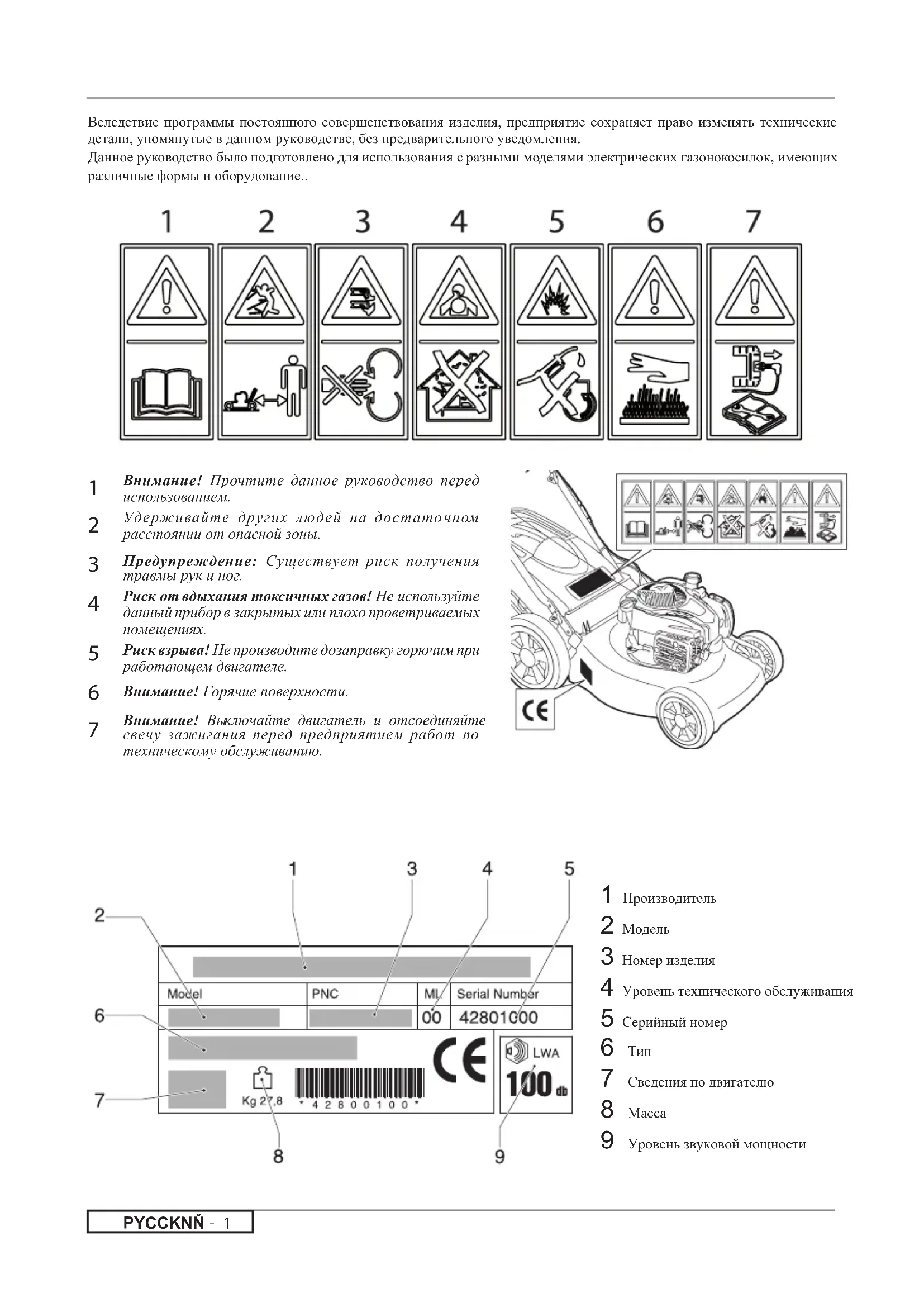 Внимание! Прочтите данное руководство перед использованием. Удерживайте других людей на достаточном расстоянии от опасной зоны. Предупреждение: Существует риск получения травмы рук и ног. Риск от вдыхания токсичных газов! Не используйте данный прибор в закрытых или плохо проветриваемых помещениях. Риск взрыва! Не производите дозаправку горючим при работающем двигателе. Внимание! Горячие поверхности. Внимание! Вы ключайте двигатель и отсоединяйте свечу зажигания перед предприятием работ по техническому обслуживанию. 1 Производитель 2 Модель 3 Номер изделия 4 Уровень технического обслуживания 5 Серийный номер 6 Тип 7 Сведения по двигателю 8 Масса 9 Уровень звуковой мощностиPYCCKNŇ - 2 ПРАВИЛА БЕЗОПАСНОСТИ Правила техники безопасности при эксплуатации самоходной ротационной газонокосилки ВАЖНО: Режущие механизмы этой машины могут привести к ампутации верхних или нижних конечностей, а также вызвать выброс предметов на расстояние. Несоблюдение следующих инструкции по технике безопасности может привести к получению тяжелый телесных повреждений и смерти.