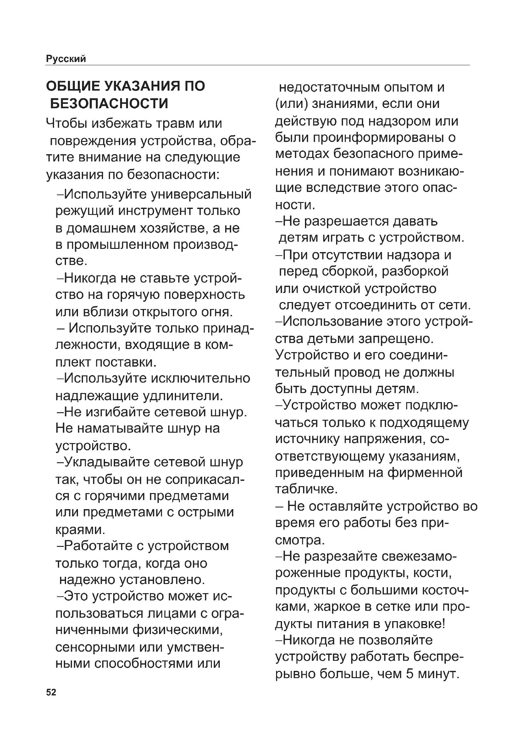 ОБЩИЕ УКАЗАНИЯ ПО БЕЗОПАСНОСТИ Чтобы избежать травм или повреждения устройства, обра- тите внимание на следующие указания по безопасности: – Используйте универсальный режущий инструмент только в домашнем хозяйстве, а не в промышленном производ-