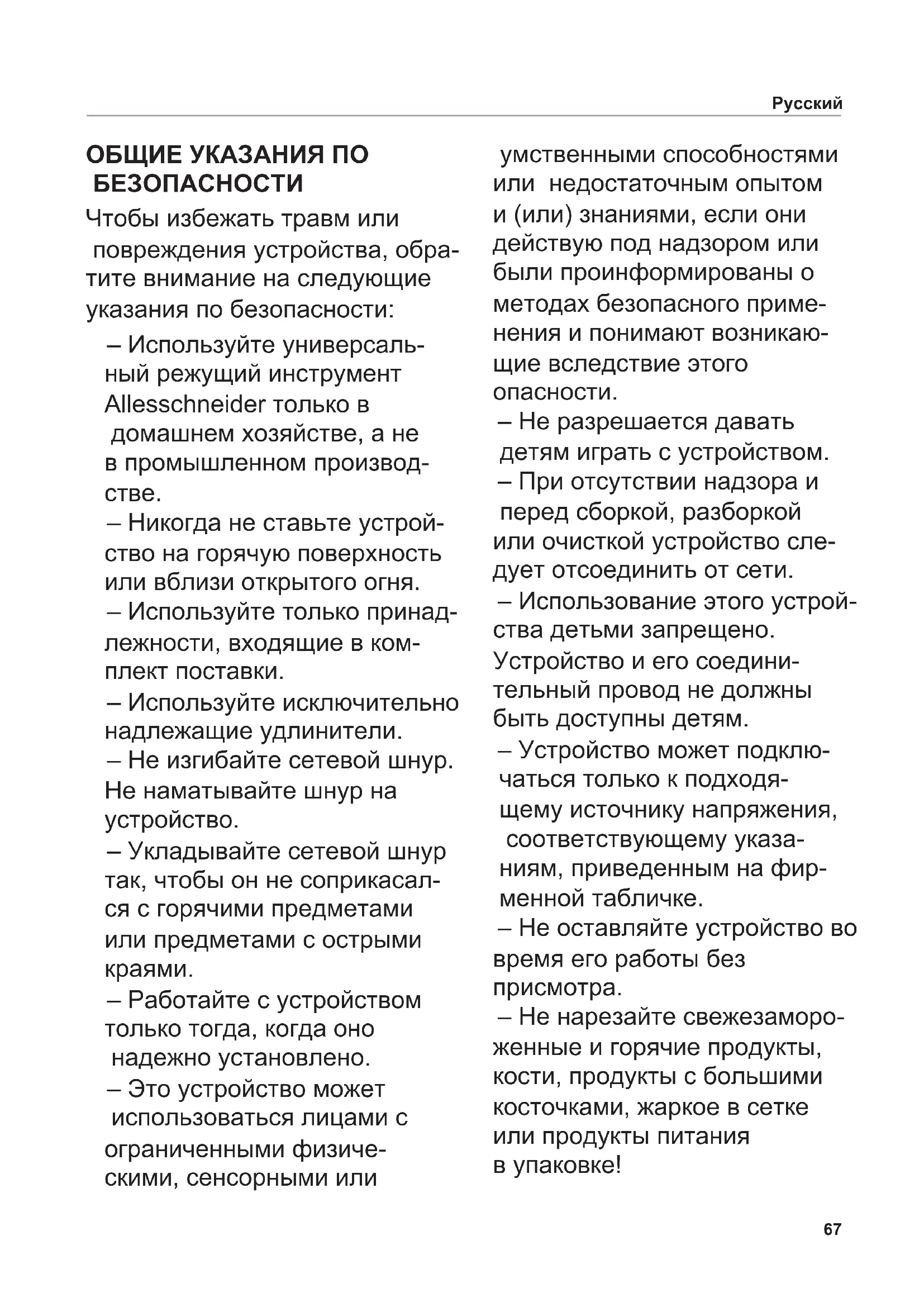 ОБЩИЕ УКАЗАНИЯ ПО БЕЗОПАСНОСТИ Чтобы избежать травм или повреждения устройства, обра- тите внимание на следующие указания по безопасности: – Используйте универсаль- ный режущий инструмент Allesschneider только в домашнем хозяйстве, а не в промышленном производ-