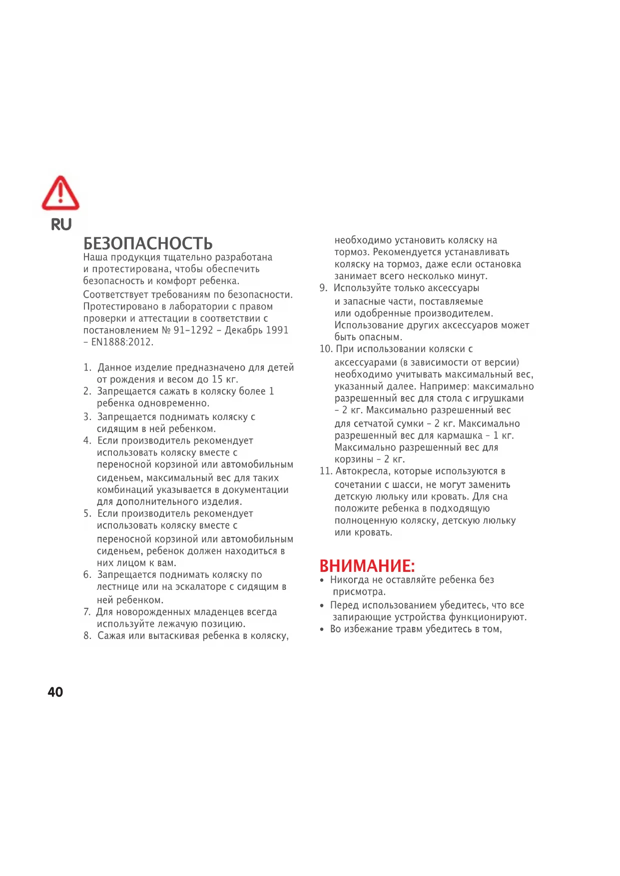 БЕЗОПАСНОСТЬ Наша продукция тщательно разработана и протестирована, чтобы обеспечить безопасность и комфорт ребенка. Соответствует требованиям по безопасности. Протестировано в лаборатории с правом проверки и аттестации в соответствии с постановлением № 91-1292 - Декабрь 1991 - EN1888:2012.