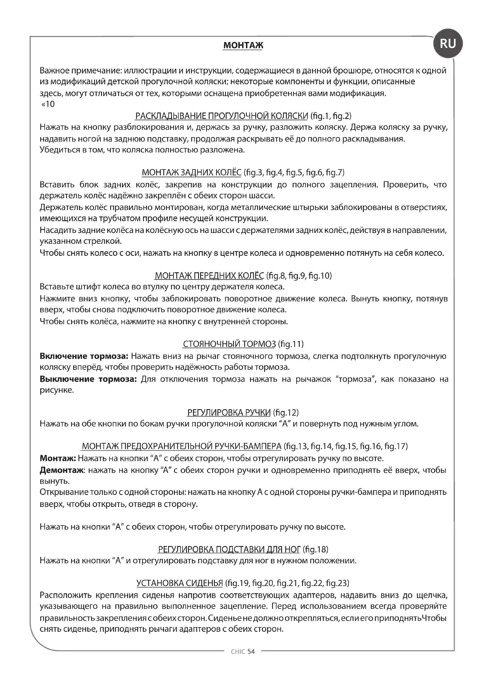 Чтобы снять автокресло, приподнять рычаги адаптеров с обеих сторон. МОНТАЖCHIC 57 ВНИМАНИЕ: Прогулочная коляска предназначена для детей старше 6-ти месяцев с максимальным весом 15 кг. ВНИМАНИЕ: Убедиться в том, что пользователи коляски ознакомлены с правильной её эксплуатацией. ВНИМАНИЕ: Монтаж и регулировка прогулочной коляски должны выполняться исключительно