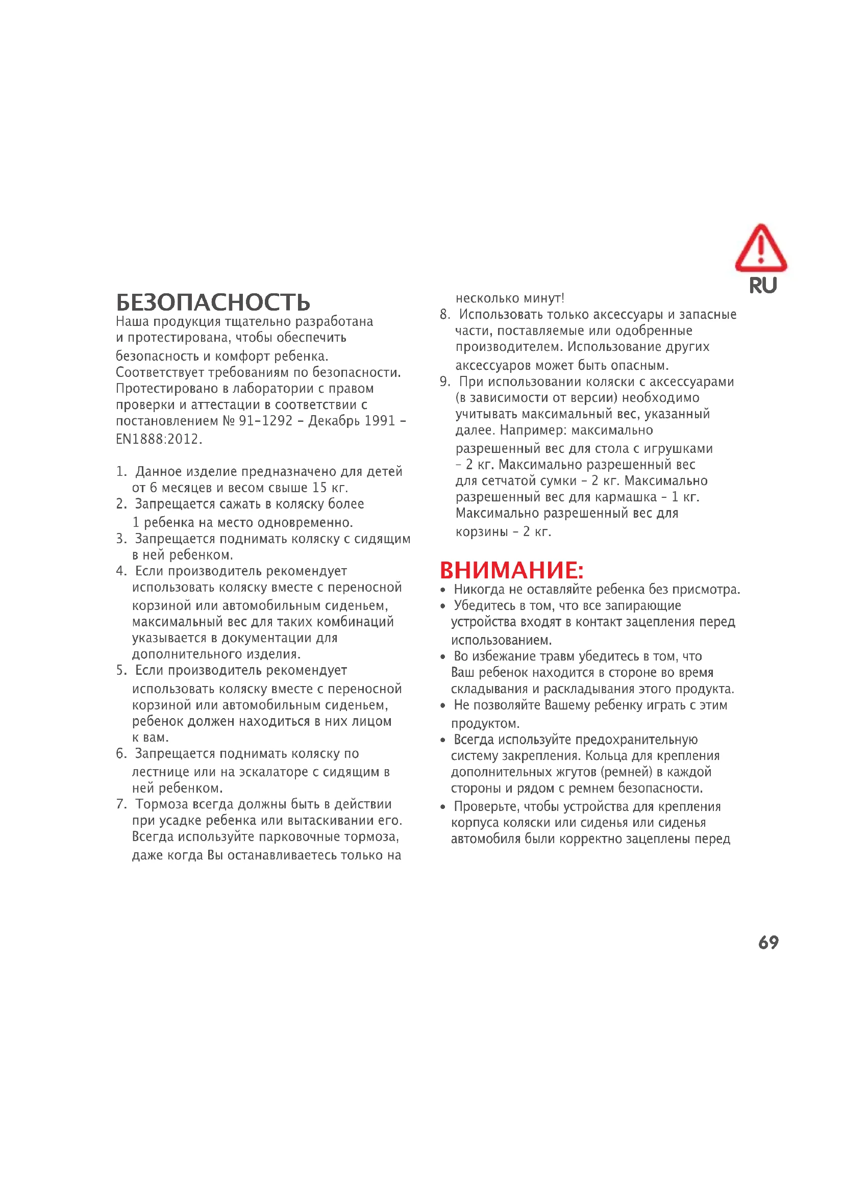 БЕЗОПАСНОСТЬ Наша продукция тщательно разработана и протестирована, чтобы обеспечить безопасность и комфорт ребенка. Соответствует требованиям по безопасности. Протестировано в лаборатории с правом проверки и аттестации в соответствии с постановлением № 91-1292 - Декабрь 1991 - EN1888:2012.