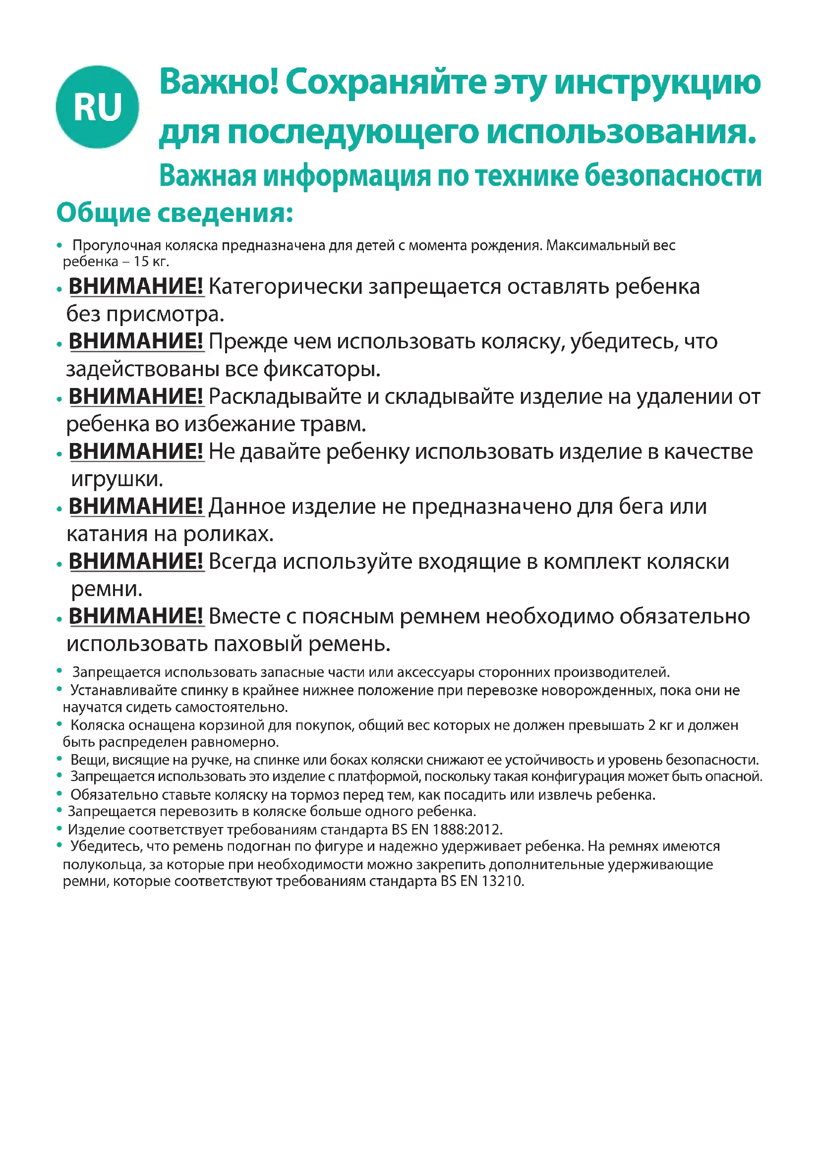 Обслуживание - Необходимо регулярно осматривать фиксаторы, тормоза, колеса, удерживающие ремни, защелки, регуляторы, шарниры и крепления. Они должны быть полностью исправны и находиться в рабочем состоянии. Движущиеся части должны перемещаться свободно. Они должны всегда вращаться свободно и практически не требуют технического обслуживания. Тем не менее, рекомендуется регулярно наносить тонкий слой смазки (только силикон из баллончика, запрещается использовать смазочное масло и консистентную смазку), чтобы продлить срок службы коляски и упростить процесс раскладывания и складывания. Техническое обслуживание и ремонт коляски следует производить перед ее использованием для второго ребенка или по истечении полутора лет (в зависимости от того, что наступит раньше).