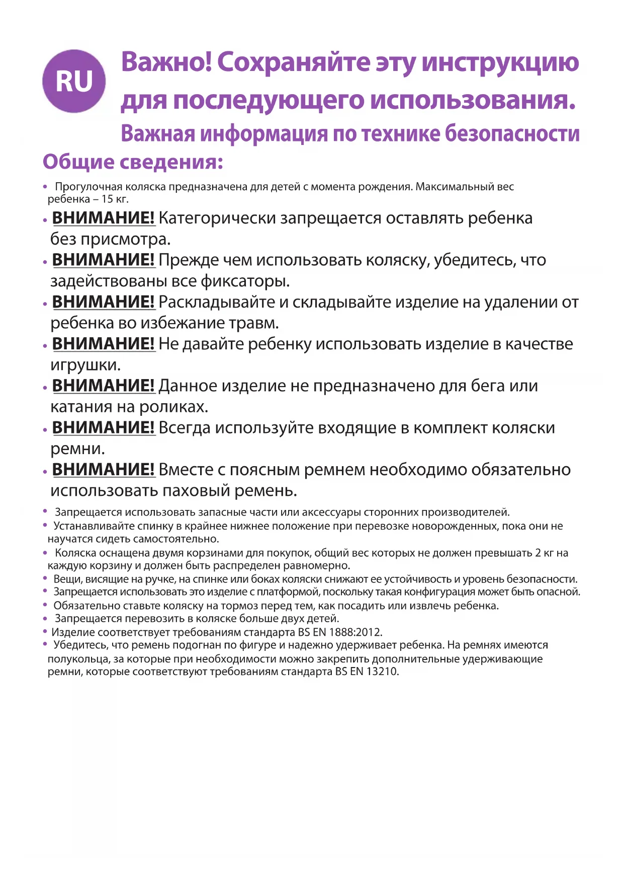 Обслуживание - Необходимо регулярно осматривать фиксаторы, тормоза, колеса, удерживающие ремни, защелки, регуляторы, шарниры и крепления. Они должны быть полностью исправны и находиться в рабочем состоянии. Движущиеся части должны перемещаться свободно. Они должны всегда вращаться свободно и практически не требуют технического обслуживания. Тем не менее, рекомендуется регулярно наносить тонкий слой смазки (только силикон из баллончика, запрещается использовать смазочное масло и консистентную смазку), чтобы продлить срок службы коляски и упростить процесс раскладывания и складывания. Техническое обслуживание и ремонт коляски следует производить перед ее использованием для второго ребенка или по истечении полутора лет (в зависимости от того, что наступит раньше).