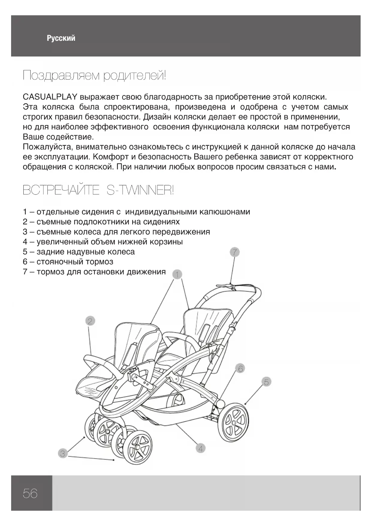 Поздравляем родителей! CASUALPLAY выражает свою благодарность за приобретение этой коляски. Эта коляска была спроектирована, произведена и одобрена с учетом самых строгих правил безопасности. Дизайн коляски делает ее простой в применении, но для наиболее эффективного освоения функционала коляски нам потребуется Ваше содействие. Пожалуйста, внимательно ознакомьтесь с инструкцией к данной коляске до начала ее эксплуатации. Комфорт и безопасность Вашего ребенка зависят от корректного обращения с коляской. При наличии любых вопросов просим связаться с нами. ВСТРЕЧАЙТЕ S-TWINNER! 1 – отдельные сидения с индивидуальными капюшонами 2 – съемные подлокотники на сидениях 3 – съемные колеса для легкого передвижения 4 – увеличенный объем нижней корзины 5 – задние надувные колеса 6 – стояночный тормоз 7 – тормоз для остановки движения57 Внимательно прочитайте инструкцию перед эксплуатацией и запомните для применения в будущем. Безопасность Вашего ребенка может быть подвержена серьезному риску, если не следовать данной инструкции. Это передвижное средство предназначено для детей от рождения и до достижения ими веса в 15 кг. ПРЕДОСТЕРЕЖЕНИЯ И ПРИМЕЧАНИЯ ПО БЕЗОПАСНОСТИ! ОСТОРОЖНО: Возможно возникновение опасной ситуации, если ребенок оставлен без присмотра. ОСТОРОЖНО: Перед началом эксплуатации удостоверьтесь, что все блокирующие устройства исправны. ОСТОРОЖНО: Воспользуйтесь ремнями безопасности, когда ребенок научится сидеть самостоятельно. ОСТОРОЖНО: Любой груз, прикрепленный к ручке, может нарушить устойчивость