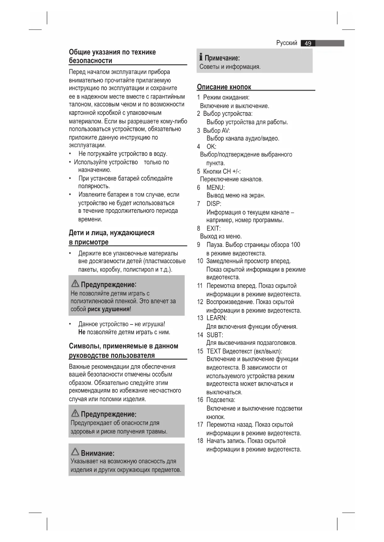 19 Замедленный просмотр назад. В режиме видеотекста при выборе страницы можно осуществлять переключение из режима видеотекста в режим ТВ. Для выбора страницы снова нажмите эту кнопку.