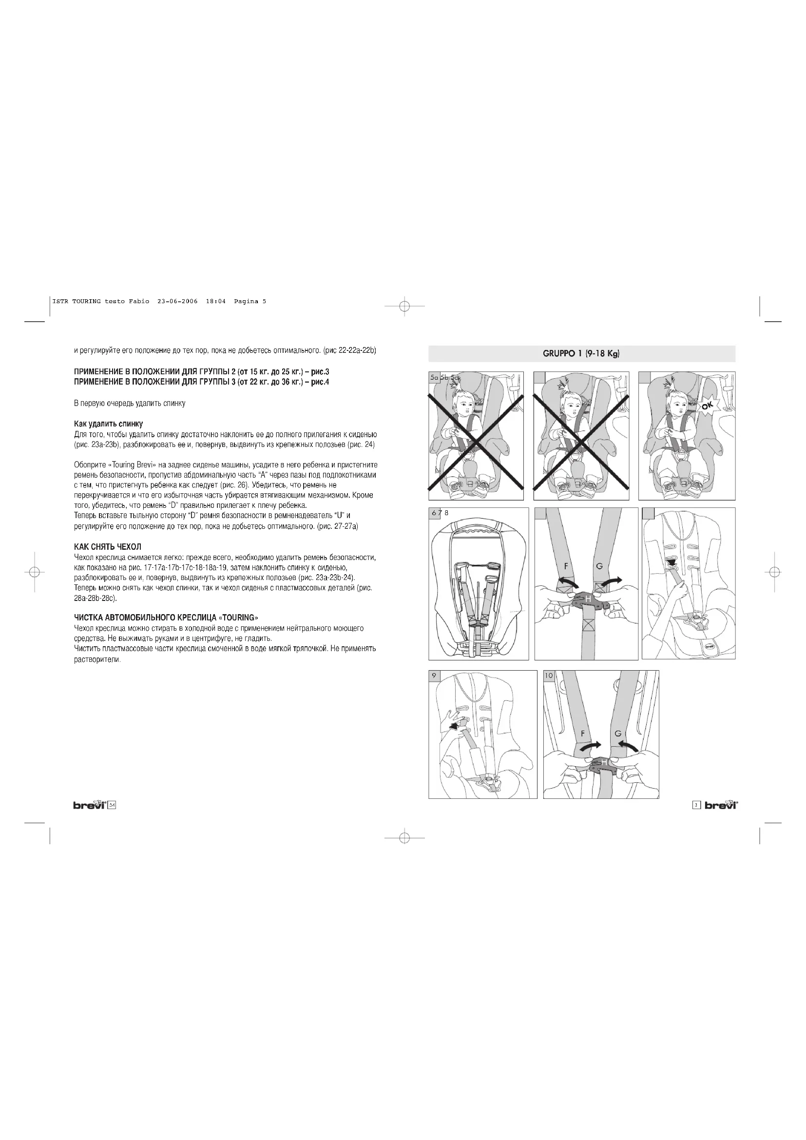 ISTR TOURING testo Fabio 23-06-2006 18:04 Pagina 11УЯ еред тем как установить автомобильное креслице «Touring Brevi», внимательно прочтите инструкции и следуйте им в указанном порядке. анные инструкции являются очень важными с точки зрения безопасности вашего ребенка в машине. ля дальнейшего использования советуем хранить инструкцию в надежном месте. Убедитесь, что креслице «Touring Brevi» не может быть повреждено опрокидывающимся креслом или дверцей вашей машины. еред каждой поездкой регулируйте ремень безопасности под тип одежды вашего ребенка. репление под зимнюю одежду будет слишком широким для ребенка, который одет в летнюю одежду. сли ваша машина стоит под солнцем, закройте «Touring Brevi» тканью. Оставленные под солнцем металлические и пластмассовые части при прикосновении к ним могут обжечь. ехол может выгореть. ри подъеме креслица «Touring Brevi» убедитесь, что вы берете его за сиденье и спинку одновременно; не поднимайте его только за спинку или подголовник. огда не используете «Touring Brevi», храните его в надежном месте. е ставьте на креслице тяжелые предметы. е оставляйте его вблизи источников тепла, таких как