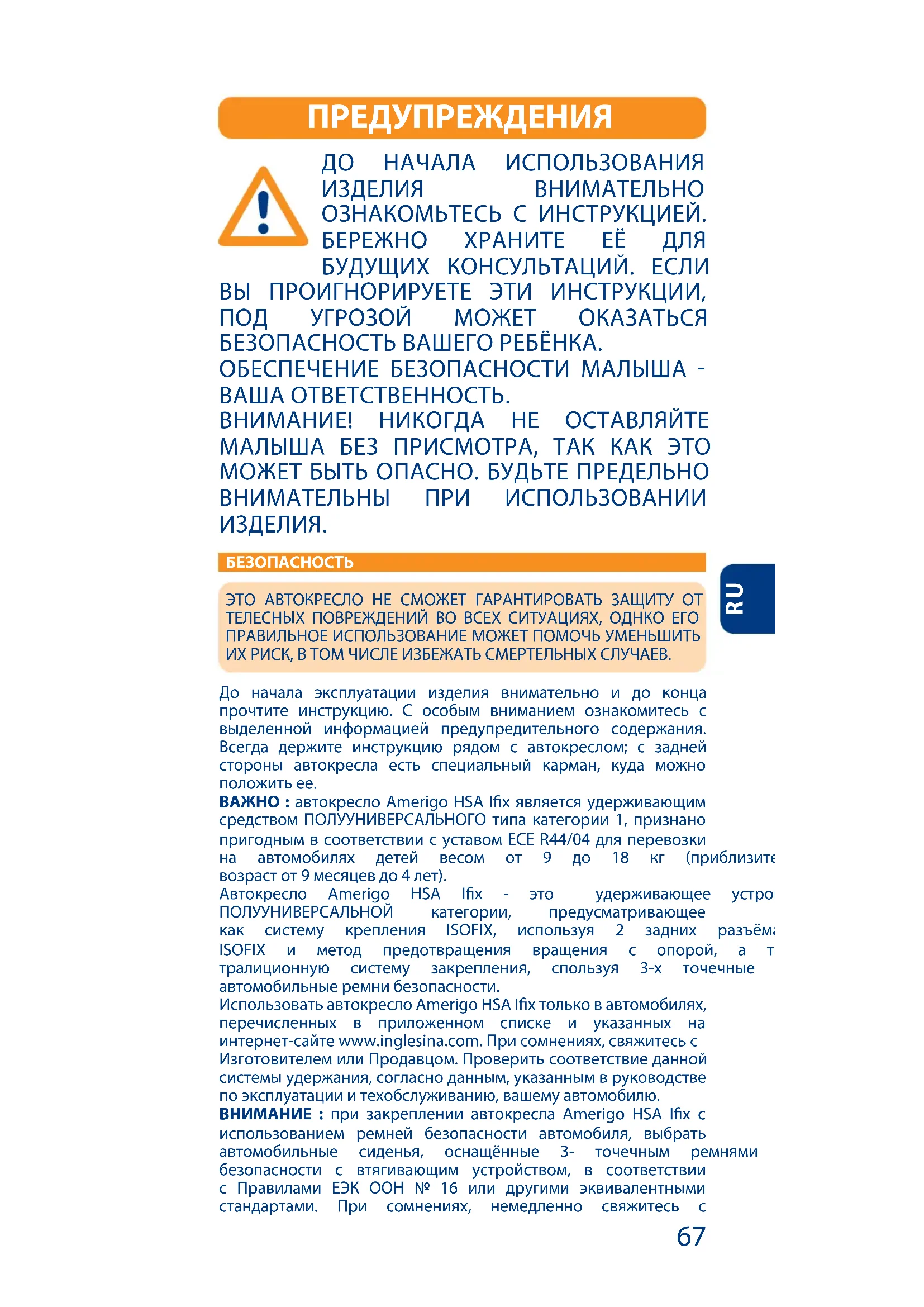 БЕЗОПАСНОСТЬ ЭТО АВТОКРЕСЛО НЕ СМОЖЕТ ГАРАНТИРОВАТЬ ЗАЩИТУ ОТ ТЕЛЕСНЫХ ПОВРЕЖДЕНИЙ ВО ВСЕХ СИТУАЦИЯХ, ОДНКО ЕГО ПРАВИЛЬНОЕ ИСПОЛЬЗОВАНИЕ МОЖЕТ ПОМОЧЬ УМЕНЬШИТЬ ИХ РИСК, В ТОМ ЧИСЛЕ ИЗБЕЖАТЬ СМЕРТЕЛЬНЫХ СЛУЧАЕВ. До начала эксплуатации изделия внимательно и до конца прочтите инструкцию. С особым вниманием ознакомитесь с выделенной информацией предупредительного содержания. Всегда держите инструкцию рядом с автокреслом; с задней стороны автокресла есть специальный карман, куда можно положить ее. ВАЖНО : автокресло Amerigo HSA Ix является удерживающим средством ПОЛУУНИВЕРСАЛЬНОГО типа категории 1, признано пригодным в соответствии с уставом ECE R44/04 для перевозки ʣʖ ʖʘʨʤʢʤʗʞʡʵʫ ʚʛʨʛʟ ʘʛʧʤʢ ʤʨ ʚʤ ʠʙ ʥʦʞʗʡʞʝʞʨʛʡʲʣʱʟ ʘʤʝʦʖʧʨʤʨʢʛʧʵʬʛʘʚʤʡʛʨ ɶʘʨʤʠʦʛʧʡʤ "NFSJHP )4" *öY ʳʨʤ ʩʚʛʦʜʞʘʖʴʯʛʛ ʩʧʨʦʤʟʧʨʘʤ ПОЛУУНИВЕРСАЛЬНОЙ категории, предусматривающее ʠʖʠ ʧʞʧʨʛʢʩ ʠʦʛʥʡʛʣʞʵ *40'*9 ʞʧʥʤʡʲʝʩʵ ʝʖʚʣʞʫ ʦʖʝʰʶʢʖ *40'*9 ʞ ʢʛʨʤʚ ʥʦʛʚʤʨʘʦʖʯʛʣʞʵ ʘʦʖʯʛʣʞʵ ʧ ʤʥʤʦʤʟ ʖ ʨʖʠʜʛ ʨʦʖʡʞʬʞʤʣʣʩʴ ʧʞʧʨʛʢʩ ʝʖʠʦʛʥʡʛʣʞʵ ʧʥʤʡʲʝʩʵ ʫ ʨʤʭʛʭʣʱʛ автомобильные ремни безопасности. Использовать автокресло Amerigo HSA Ix только в автомобилях, перечисленных в приложенном списке и указанных на ʞʣʨʛʦʣʛʨʧʖʟʨʛXXXJOHMFTJOBDPNʅʦʞʧʤʢʣʛʣʞʵʫʧʘʵʜʞʨʛʧʲʧ Изготовителем или Продавцом. Проверить соответствие данной системы удержания, согласно данным, указанным в руководстве по эксплуатации и техобслуживанию, вашему автомобилю. ВНИМАНИЕ : при закреплении автокресла Amerigo HSA Ix с использованием ремней безопасности автомобиля, выбрать ʖʘʨʤʢʤʗʞʡʲʣʱʛ ʧʞʚʛʣʲʵ ʤʧʣʖʯʶʣʣʱʛ ʨʤʭʛʭʣʱʢ ʦʛʢʣʵʢʞ безопасности с втягивающим устройством, в соответствии с Правилами ЕЭК ООН № 16 или другими эквивалентными стандартами. При сомнениях, немедленно свяжитесь с ПРЕДУПРЕЖДЕНИЯ68
