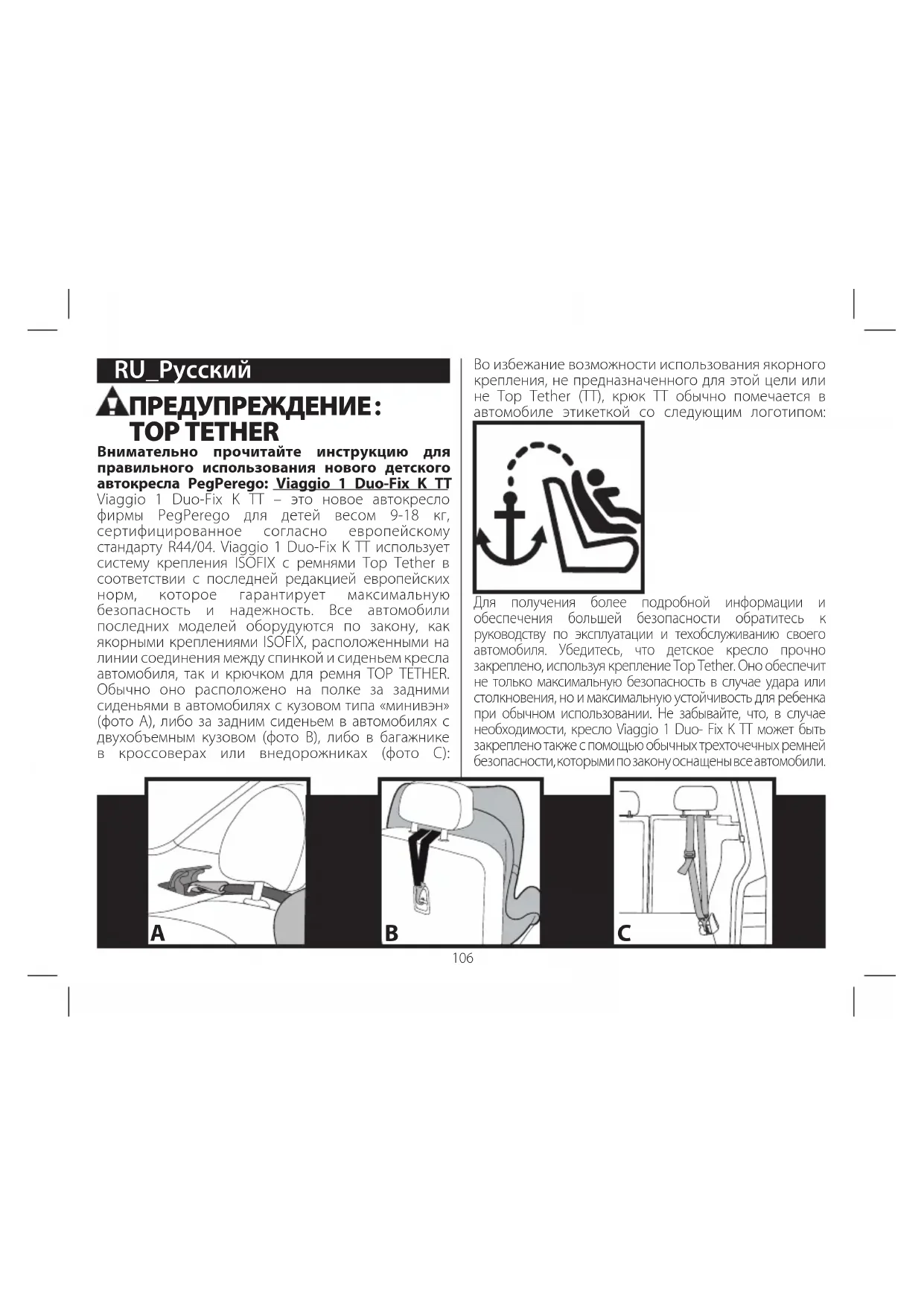 - Serijska številka proizvodnje: je na vsakem avtosedežu drugačna, edinstvena. Pri homologaciji dobi vsak avtosedež svojo številko. PEG-PÉREGO S.p.A. Peg Pérego S.p.A. ima certifikat ISO 9001. Certifikat za stranke in uporabnike pomeni garancijo transparentnosti in zaupanja v delo podjetja. Peg Perego se lahko kadarkoli odloči, da bo spremenil modele, objavljene v katalogu, najsi bo to zaradi tehničnih ali podjetniških razlogov. Peg Pérego je vedno na voljo svojim strankam, da v kar največji meri izpolni njihove potrebe. Zato je za nas zelo pomembno, da poznamo mnenje svojih strank. Hvaležni vam bomo, če si boste, ko boste uporabili naš izdelek, vzeli čas in izpolnili VPRAŠALNIK O ZADOVOLJSTVU STRANK, ki ga boste našli na naših spletnih straneh, na naslovu: www.pegperego.com Center za pomoč uporabnikom Če izgubite ali poškodujete sestavni del izdelka, uporabite izključno originalne rezervne dele Peg Pérego. V primeru popravil, zamenjav, podatkov o izdelku in naročila originalnih nadomestnih delov in dodatkov, se obrnite na službo za pomoč uporabnikom Peg Perego, pri tem pa navedite serijsko številko izdelka, če je le-ta navedena. Tel. 0039/039/6088213 Faks. 0039/039/3309992 E-pošta: assistenza@pegperego.it E-pošta: www.pegperego.com106 ПРЕДУПРЕЖДЕНИЕ : TOP TETHER Внимательно прочитайте инструкцию для правильного использования нового детского автокресла PegPerego: Viaggio 1 Duo-Fix K TT Viaggio 1 Duo-Fix K TT – это новое автокресло фирмы PegPerego для детей весом 9-18 кг, сертифицированное согласно европейскому стандарту R44/04. Viaggio 1 Duo-Fix K TT использует систему крепления ISOFIX с ремнями Top Tether в соответствии с последней редакцией европейских норм, которое гарантирует максимальную безопасность и надежность. Все автомобили последних моделей оборудуются по закону, как якорными креплениями ISOFIX, расположенными на линии соединения между спинкой и сиденьем кресла автомобиля, так и крючком для ремня TOP TETHER. Обычно оно расположено на полке за задними сиденьями в автомобилях с кузовом типа «минивэн» (фото А), либо за задним сиденьем в автомобилях с двухобъемным кузовом (фото В), либо в багажнике в кроссоверах или внедорожниках (фото C): RU_Pусский Во избежание возможности использования якорного крепления, не предназначенного для этой цели или не Top Tether (ТТ), крюк ТТ обычно помечается в автомобиле этикеткой со следующим логотипом: Для получения более подробной информации и обеспечения большей безопасности обратитесь к руководству по эксплуатации и техобслуживанию своего автомобиля. Убедитесь, что детское кресло прочно закреплено, используя крепление Top Tether. Оно обеспечит не только максимальную безопасность в случае удара или столкновения, но и максимальную устойчивость для ребенка при обычном использовании. Не забывайте, что, в случае необходимости, кресло Viaggio 1 Duo- Fix K TT может быть закреплено также с помощью обычных трехточечных ремней безопасности, которыми по закону оснащены все автомобили. BA C Благодарим вас за то, что вы выбрали продукцию компании Peg-Pеrego. Характеристики устройства Детское автокресло, группа 1, категория «Универсальное» с ремнями безопасности автомобиля Утверждено в соответствии с Европейским нормативным требованием UN/ECE R44/04 для детей весом 9-18 кг (приблизительно от одного до четырех лет).