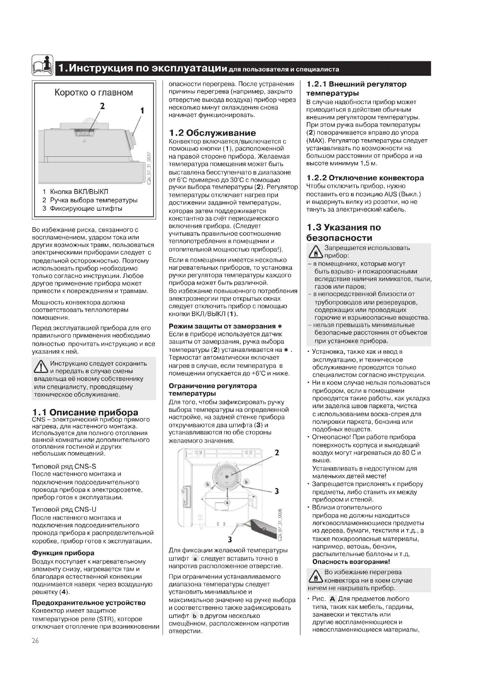 C26_07_31_0037 1.Инструкцияпоэксплуатациидляпользователяиспециалиста Во избежание риска, связанного с воспламенением, ударом тока или других возможных травм, пользоваться электрическими приборами следует с предельной осторожностью. Поэтому использовать прибор необходимо только согласно инструкции. Любое другое применение прибора может привести к повреждениям и травмам.Мощность конвектора должна соответствовать теплопотерям помещения. Перед эксплуатацией прибора для его правильного применения необходимо полностью прочитать инструкцию и все указания к ней. Инструкцию следует сохранить и передать в случае смены владельца её новому собственнику или специалисту, проводящему техническое обслуживание. 1.1Описаниеприбора CNS – электрический прибор прямого нагрева, для настенного монтажа. Используется для полного отопления ванной комнаты или дополнительного отопления гостиной и других небольших помещений. Типовой ряд CNS-S После настенного монтажа и подключения подсоединительного провода прибора к электророзетке, прибор готов к эксплуатации. Типовой ряд CNS-U После настенного монтажа и подключения подсоединительного провода прибора к распределительной коробке, прибор готов к эксплуатации. Функцияприбора Воздух поступает к нагревательному элементу снизу, нагревается там и благодаря естественной конвекции поднимается наверх через воздушную решетку (4). Предохранительноеустройство Конвектор имеет защитное температурное реле (STR), которое отключает отопление при возникновении Коротко о главном