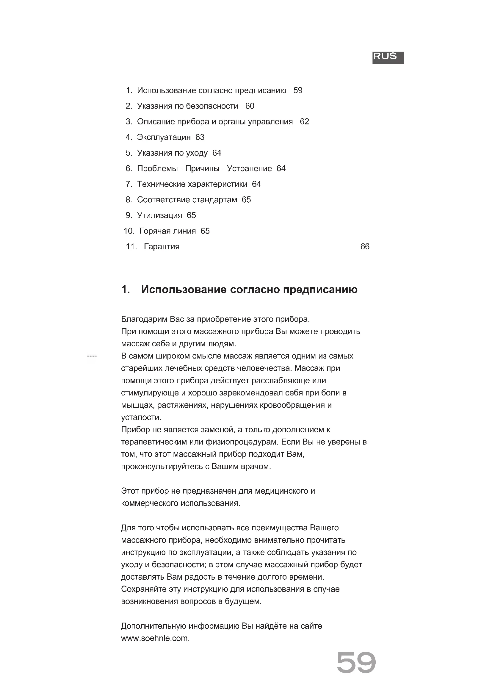 Прибор не является заменой, а только дополнением к терапевтическим или физиопроцедурам. Если Вы не уверены в том, что этот массажный прибор подходит Вам, проконсультируйтесь с Вашим врачом. Этот прибор не предназначен для медицинского и коммерческого использования. Для того чтобы использовать все преимущества Вашего массажного прибора, необходимо внимательно прочитать инструкцию по эксплуатации, а также соблюдать указания по уходу и безопасности; в этом случае массажный прибор будет доставлять Вам радость в течение долгого времени. Сохраняйте эту инструкцию для использования в случае возникновения вопросов в будущем. Дополнительную информацию Вы найдёте на сайте www.soehnle.com.60 RUS