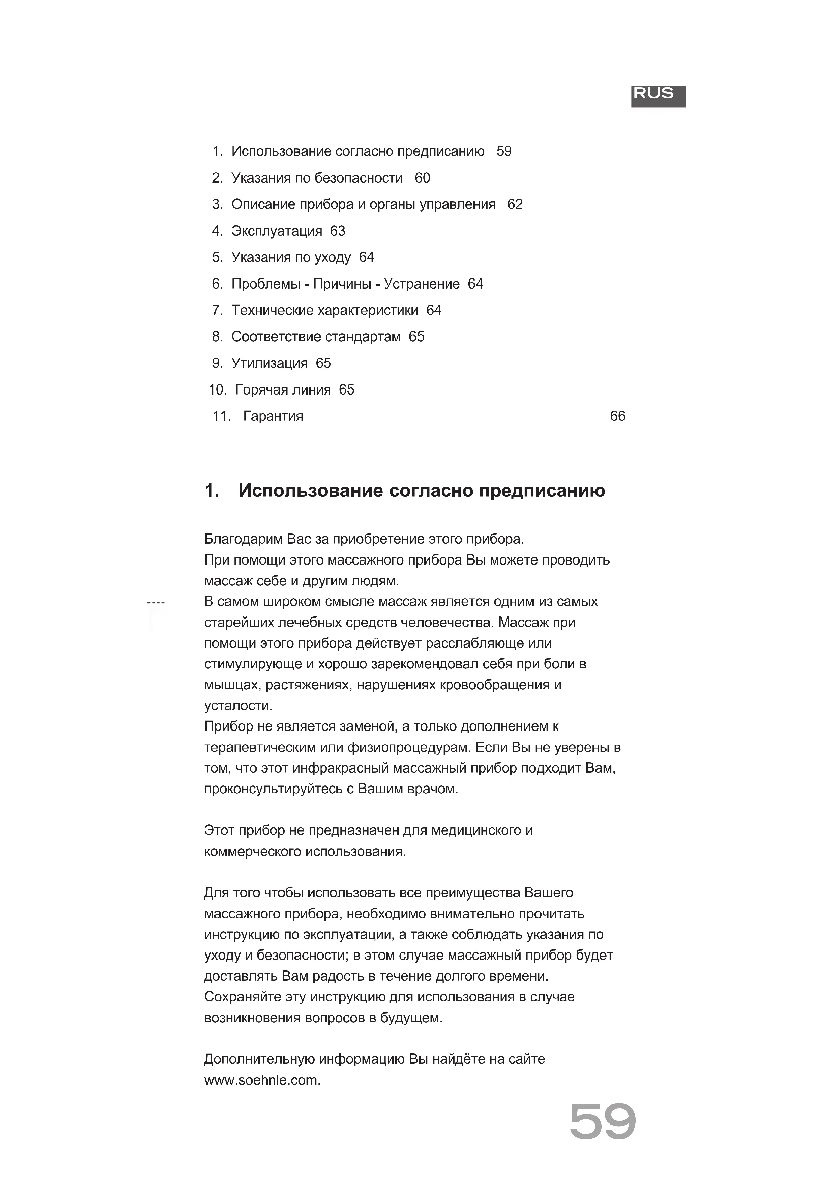 Прибор не является заменой, а только дополнением к терапевтическим или физиопроцедурам. Если Вы не уверены в том, что этот инфракрасный массажный прибор подходит Вам, проконсультируйтесь с Вашим врачом. Этот прибор не предназначен для медицинского и коммерческого использования. Для того чтобы использовать все преимущества Вашего массажного прибора, необходимо внимательно прочитать инструкцию по эксплуатации, а также соблюдать указания по уходу и безопасности; в этом случае массажный прибор будет доставлять Вам радость в течение долгого времени. Сохраняйте эту инструкцию для использования в случае возникновения вопросов в будущем. Дополнительную информацию Вы найдёте на сайте www.soehnle.com.60 RUS