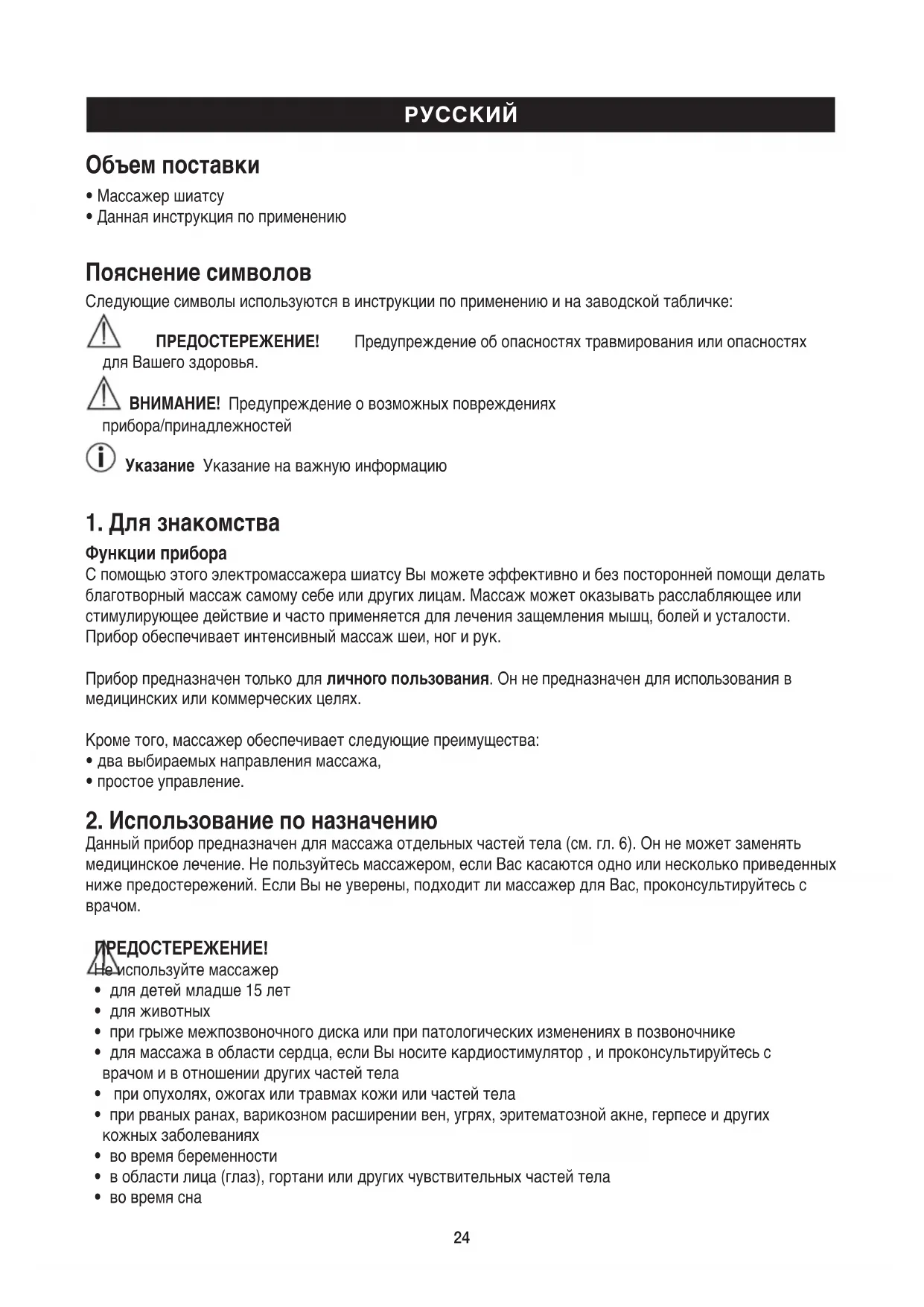 Данный прибор предназначен для массажа отдельных частей тела (см. гл. 6). Он не может заменять медицинское лечение. Не пользуйтесь массажером, если Вас касаются одно или несколько приведенных ниже предостережений. Если Вы не уверены, подходит ли массажер для Вас, проконсультируйтесь с