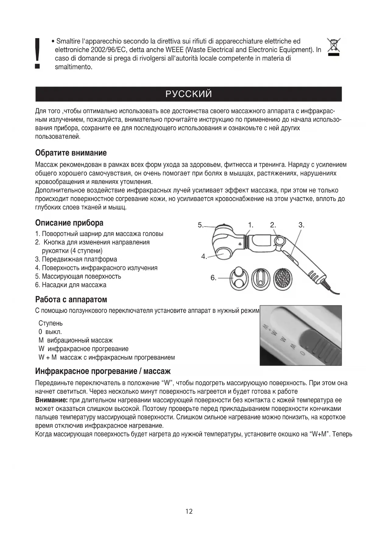 0 выкл. М вибрационный массаж W инфракрасное прогревание W + M массаж с инфракрасным прогреванием Инфракрасное прогревание / массаж Передвиньте переключатель в положение “W”, чтобы подогреть массирующую поверхность. При этом она начнет светиться. Через несколько минут поверхность нагреется и будет готова к работе Внимание: при длительном нагревании массирующей поверхности без контакта с кожей температура ее может оказаться слишком высокой. Поэтому проверьте перед прикладыванием поверхности кончиками пальцев температуру массирующей поверхности. Слишком сильное нагревание можно понизить, на короткое время отключив инфракрасное нагревание. Когда массирующая поверхность будет нагрета до нужной температуры, установите окошко на “W+M”. Теперь