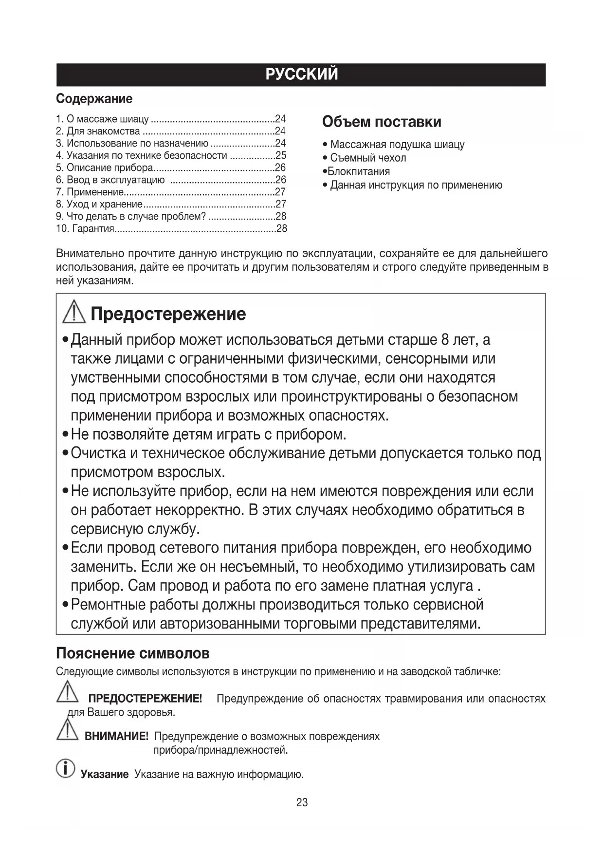 - . Гарантия Содержание24 Прибор имеет двойную защитную изоляцию и, таким образом, соответствует классу защиты 2. Использовать только в закрытых помещениях. p. 28