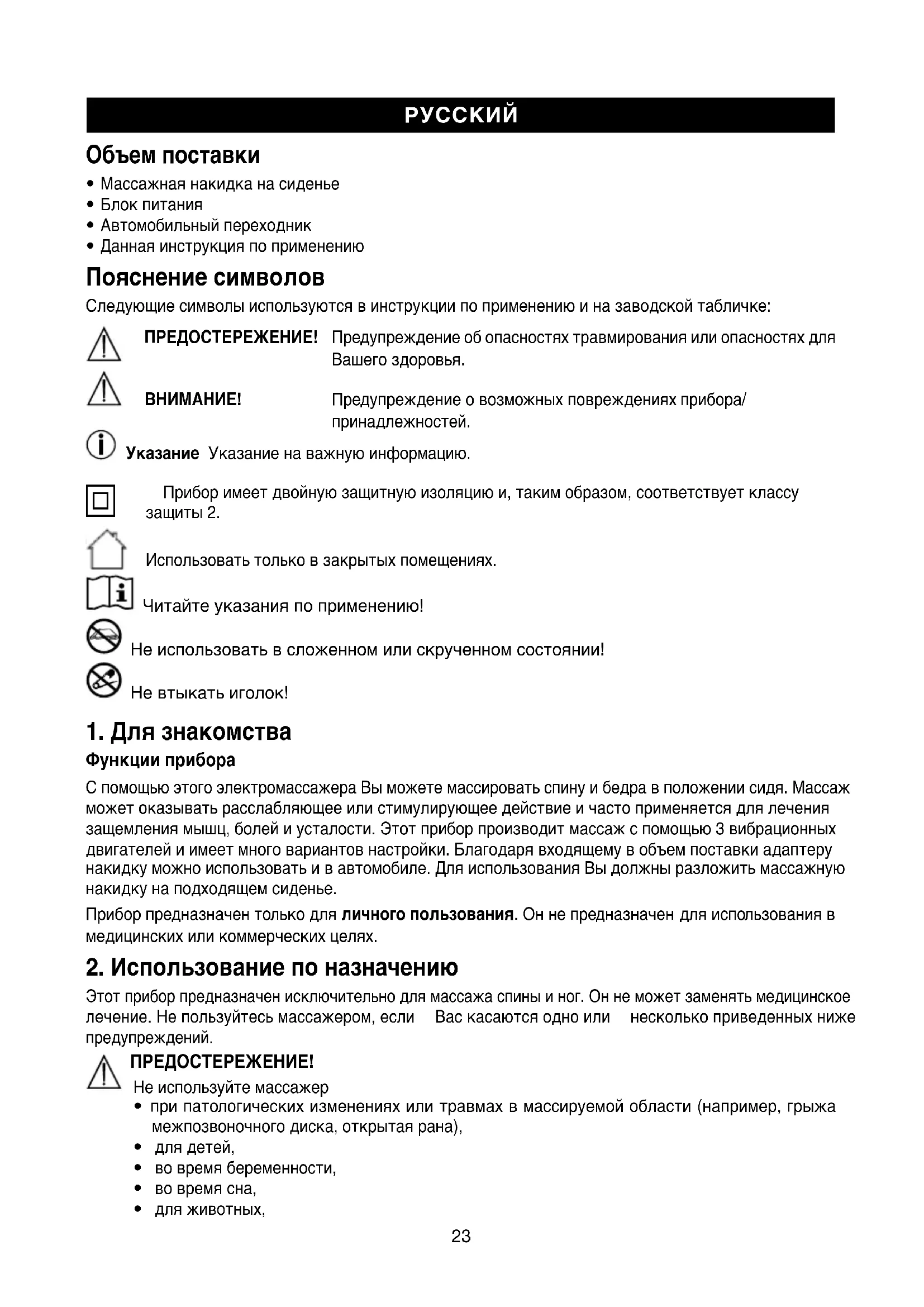 Этотприборпредназначенисключительнодлямассажаспиныиног.Оннеможетзаменятьмедицинское лечение.Непользуйтесьмассажером,если Васкасаютсяодноили несколькоприведенныхниже предупреждений. ПРЕДОСТЕРЕЖЕНИЕ! Неиспользуйтемассажер