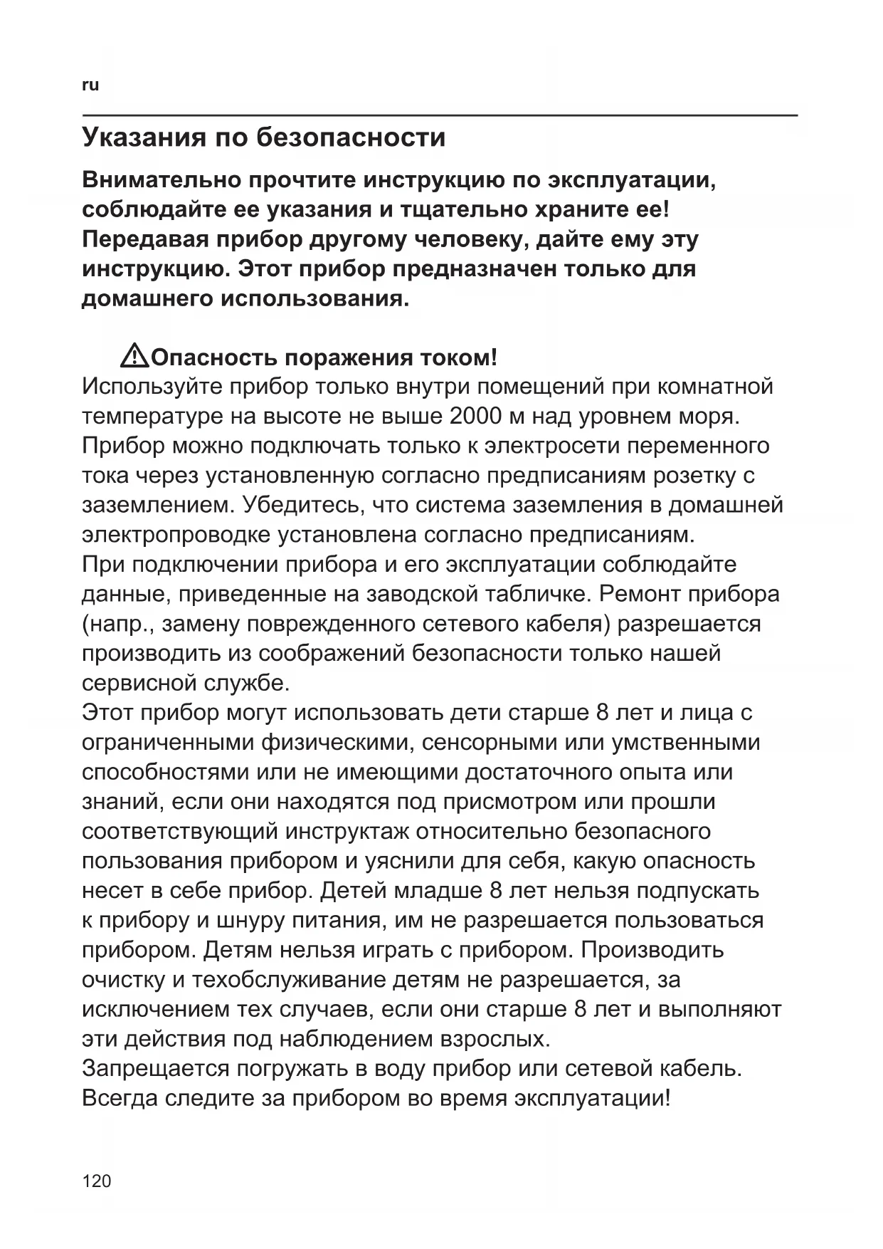 Указания по безопасности Внимательно прочтите инструкцию по эксплуатации, соблюдайте ее указания и тщательно храните ее! Передавая прибор другому человеку, дайте ему эту инструкцию. Этот прибор предназначен только для домашнего использования. WОпасность поражения током! Используйте прибор только внутри помещений при комнатной температуре на высоте не выше 2000 м над уровнем моря. Прибор можно подключать только к электросети переменного тока через установленную согласно предписаниям розетку с заземлением. Убедитесь, что система заземления в домашней электропроводке установлена согласно предписаниям. При подключении прибора и его эксплуатации соблюдайте данные, приведенные на заводской табличке. Ремонт прибора (напр., замену поврежденного сетевого кабеля) разрешается производить из соображений безопасности только нашей сервисной службе. Этот прибор могут использовать дети старше 8 лет и лица с ограниченными физическими, сенсорными или умственными способностями или не имеющими достаточного опыта или знаний, если они находятся под присмотром или прошли соответствующий инструктаж относительно безопасного пользования прибором и уяснили для себя, какую опасность несет в себе прибор. Детей младше 8 лет нельзя подпускать к прибору и шнуру питания, им не разрешается пользоваться прибором. Детям нельзя играть с прибором. Производить очистку и техобслуживание детям не разрешается, за исключением тех случаев, если они старше 8 лет и выполняют эти действия под наблюдением взрослых. Запрещается погружать в воду прибор или сетевой кабель. Всегда следите за прибором во время эксплуатации!121