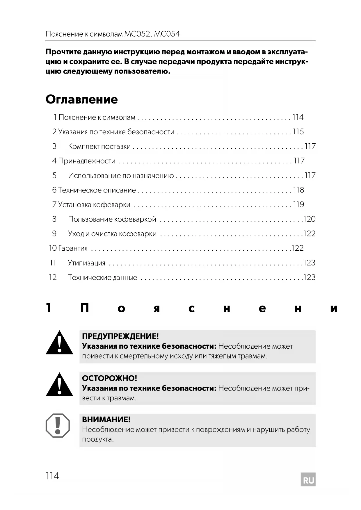- Не пользуйтесь прибором на горячих поверхностей и не устанавливайте его вблизи открытого огня. MC052-MC054-IO-16.book Seite 116 Donnerstag, 25. August 2016 11:50 11RU MC052, MC054 Комплект поставки