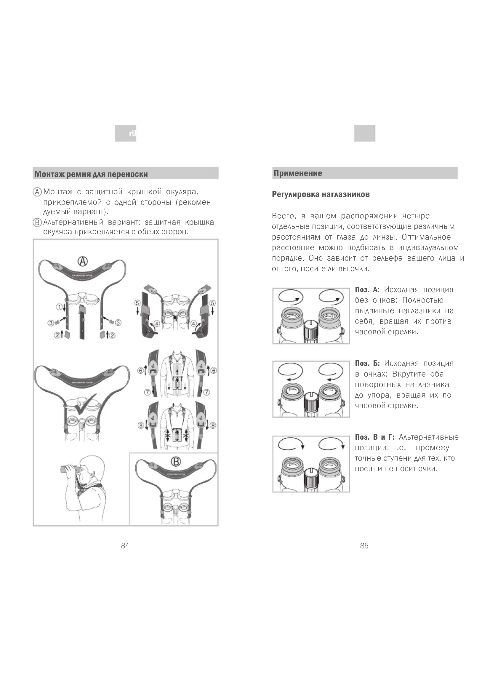 Регулировка наглазников Всего, в вашем распоряжении четыре отдельные позиции, соответствующие различным расстояниям от глаза до линзы. Оптимальное расстояние можно подбирать в индивидуальном порядке. Оно зависит от рельефа вашего лица и от того, носите ли вы очки. Поз. А: Исходная позиция без очков: Полностью выдвиньте наглазники на себя, вращая их против часовой стрелки. Поз. Б: Исходная позиция в очках: Вкрутите оба поворотных наглазника до упора, вращая их по часовой стрелке. Поз. В и Г: Альтернативные позиции, т.е. промежу- точные ступени для тех, кто носит и не носит очки. Применение87