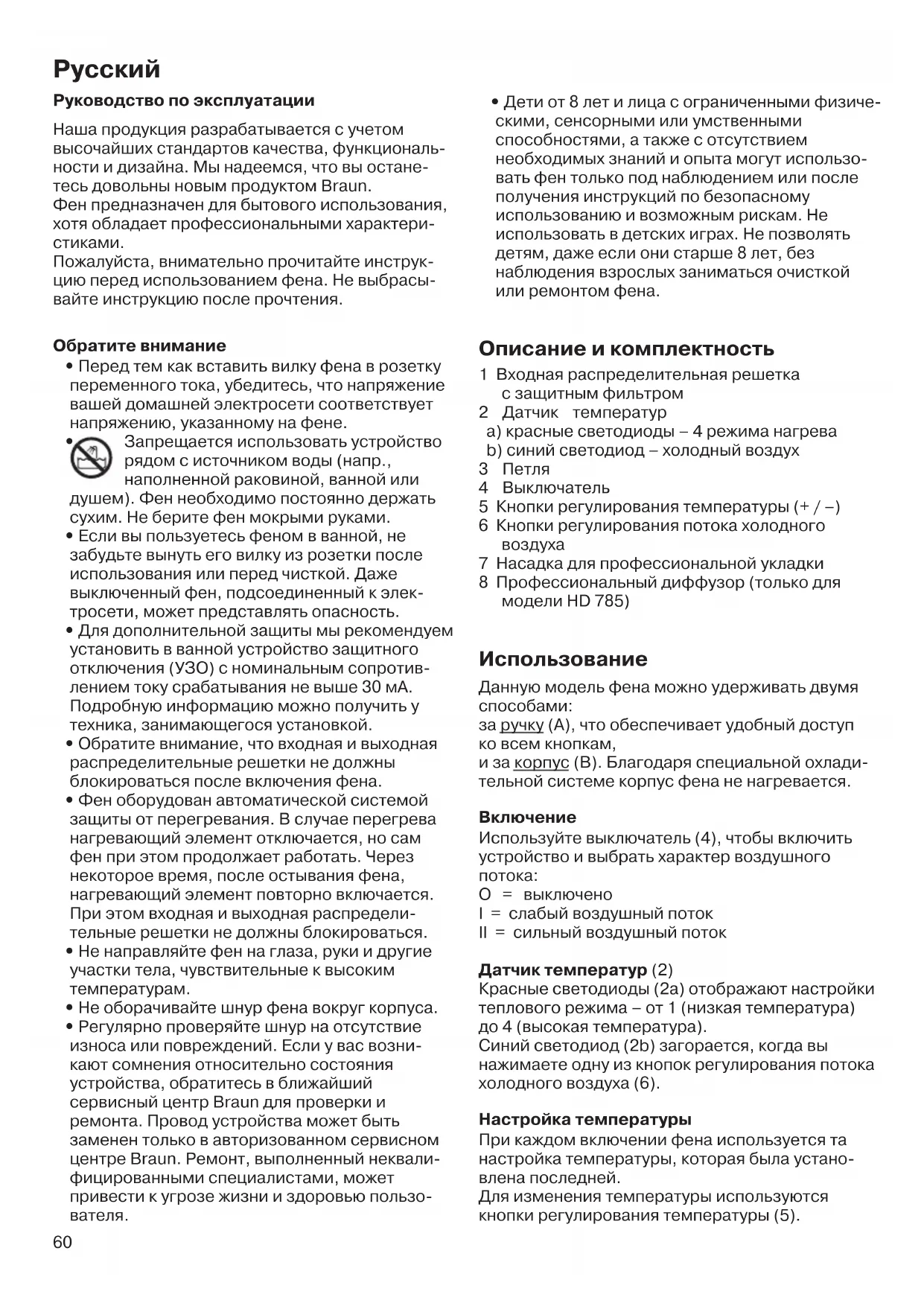 Руководство по эксплуатации Наша продукция разрабатывается с учетом высочайших стандартов качества, функциональ- ности и дизайна. Мы надеемся, что вы остане- тесь довольны новым продуктом Braun. Фен предназначен для бытового использования, хотя обладает профессиональными характери-