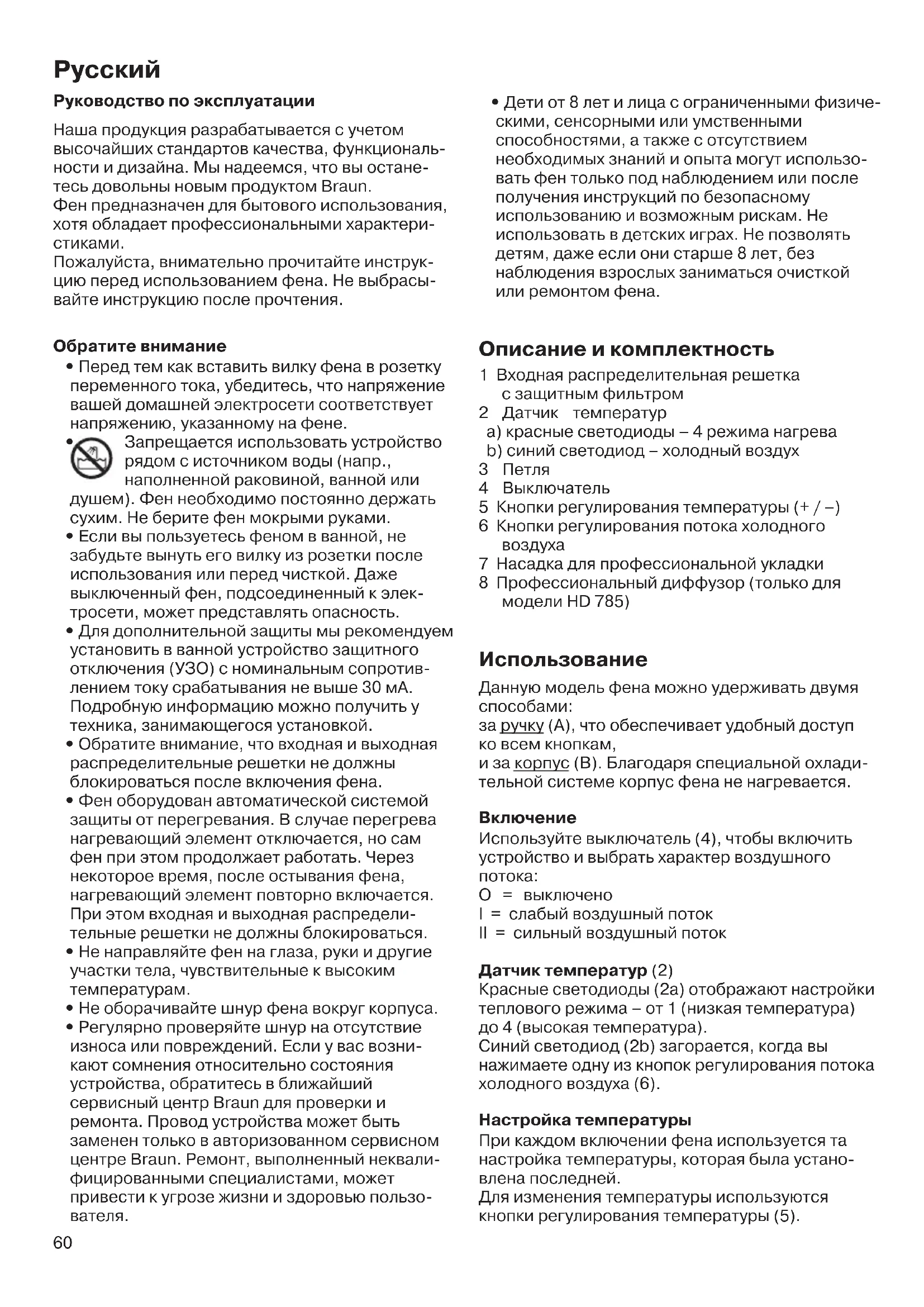 Руководство по эксплуатации Наша продукция разрабатывается с учетом высочайших стандартов качества, функциональ- ности и дизайна. Мы надеемся, что вы остане- тесь довольны новым продуктом Braun. Фен предназначен для бытового использования, хотя обладает профессиональными характери-