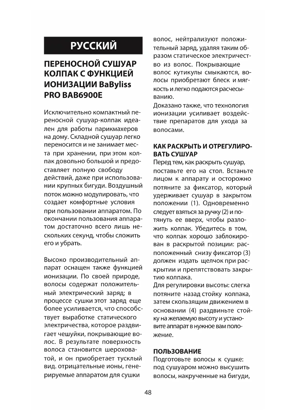 Для этого достаточно повернуть ручку влево или вправо, чтобы открыть или закрыть вентиля- ционные отверстия (6) и варьи- ровать распределение воздуха внутри колпака. КАК СЛОЖИТЬ СУШУАР Выключите аппарат. Дайте ему остыть. Отключите от сети и уло- жите шнур в предусмотренное для него отделение (7). Разбло- кируйте колпак, нажав на фикса- тор по направлению вниз. Сло- жите колпак. Убедитесь в том, что сушуар заблокирован в за- крытой позиции (проверьте фиксаторы) перед тем, как под- нять аппарат за ручку для его транспортировки. УХОД ЗА АППАРАТОМ Чтобы почистить сушуар-кол- пак, воспользуйтесь мягкой влажной тряпочкой, пропитан- ной неагрессивным моющим средством. Перед тем, как вос- пользоваться аппаратом, следу- ет каждый раз проверять, пол- ностью ли он высох. ОБРАТИТЕ ВНИМАНИЕ Колпак-сушуар BAB6900E марки BaByliss PRO оснащен термоста- том безопасности. В случае пе- регрева аппарат отключается автоматически. Несколько ми- нут спустя он возобновляет ра- боту. Тем не менее, следует про- верить, не загрязнены ли или не засорены ли вентиляционные отверстия (вверху и в основании колпака), прежде, чем вновь воспользоваться колпаком-су-