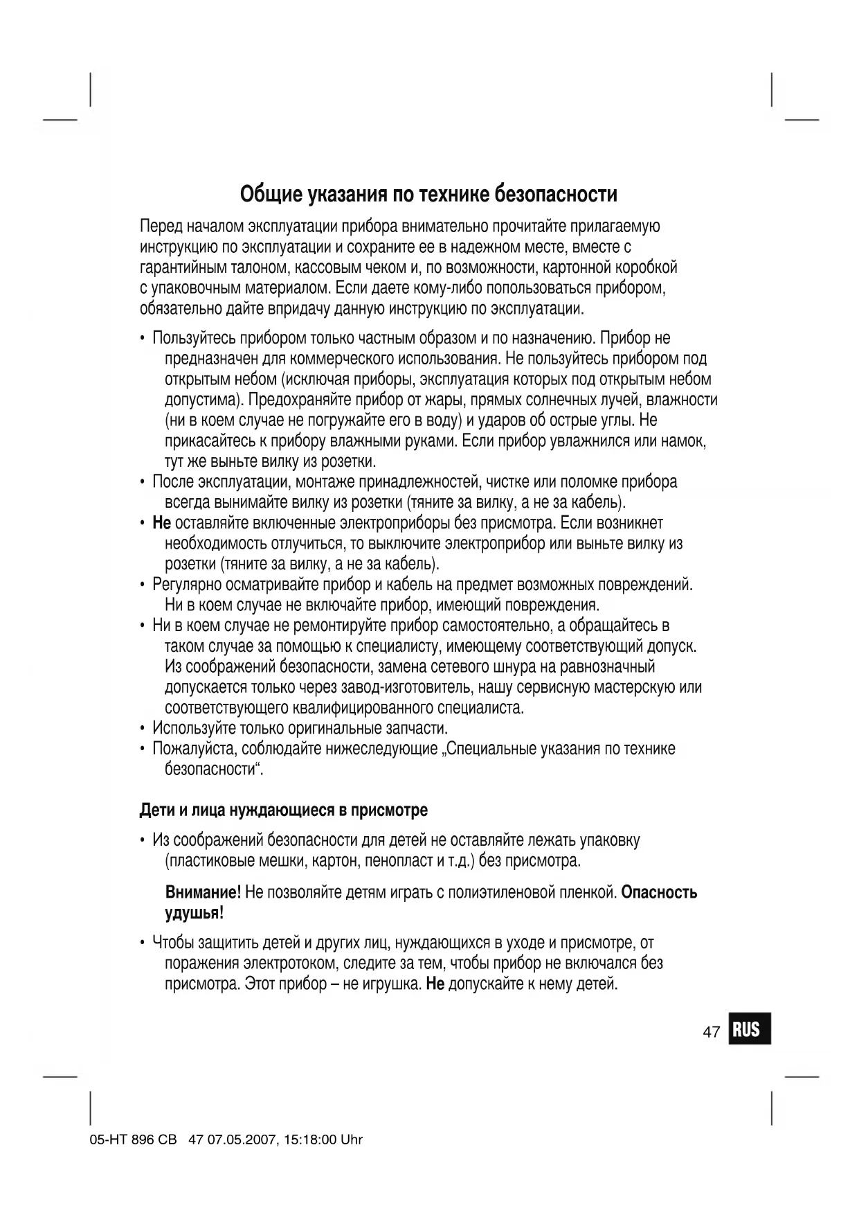 - Чтобы защитить детей и других лиц, нуждающихся в уходе и присмотре, от поражения электротоком, следите за тем, чтобы прибор не включался без присмотра. Этот прибор – не игрушка. Не допускайте к нему детей. 05-HT 896 CB 47 07.05.2007, 15:18:00 UhrRUS