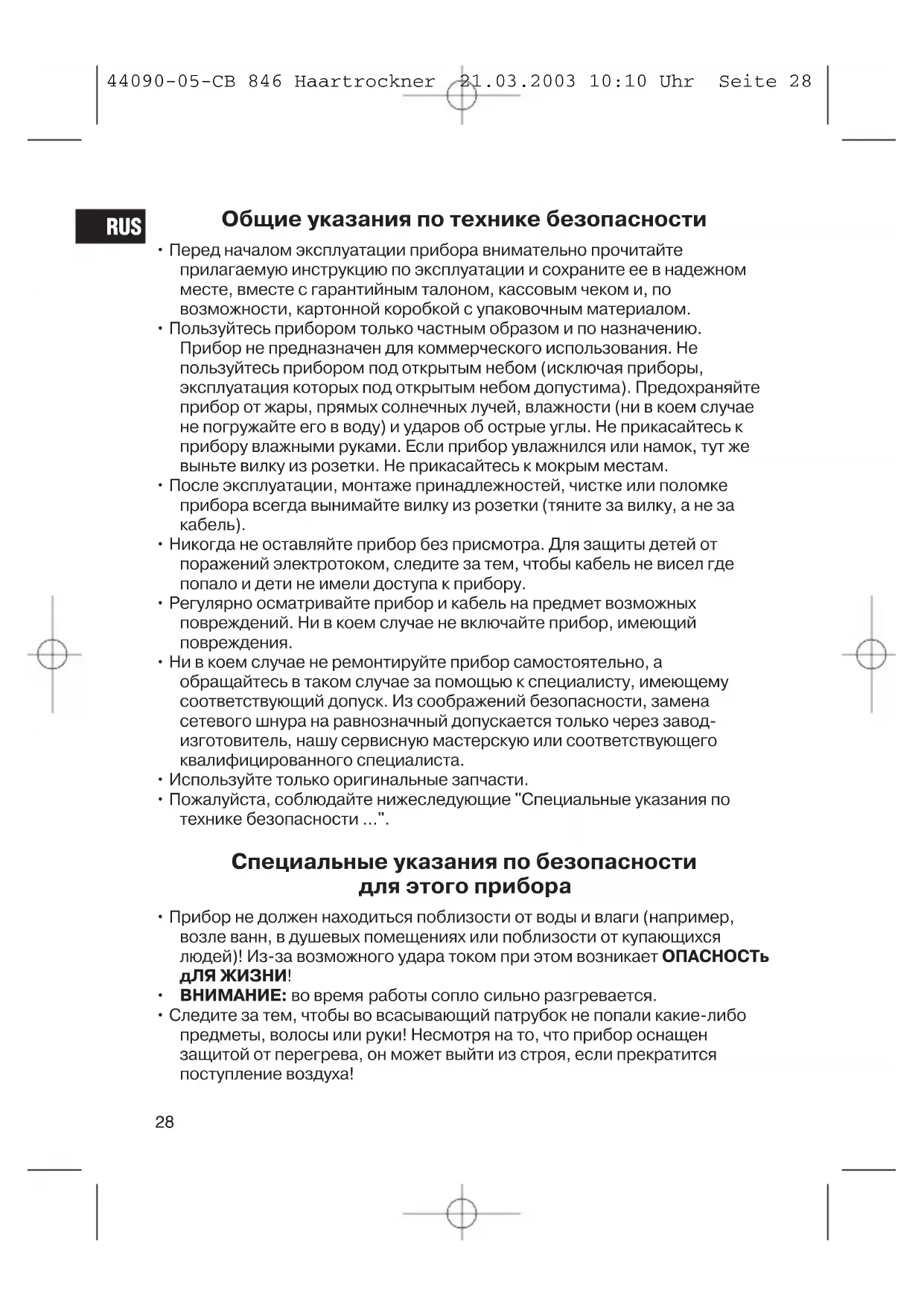 RUS 44090-05-CB 846 Haartrockner 21.03.2003 10:10 Uhr Seite 29Документом для гарантии служит кассовый чек. Без предъявления этого документа бесплатный ремонт или замена прибора невозможны. В случае поломки прибора просим вернуть его в магазин в полной комплектации и оригинальной упаковке, приложив кассовый чек. Разбитое стекло или дефектные принадлежности не являются поводом для замены прибора, а будут бесплатно присланы взамен на дефектные. В таких случаях необходимо заказывать только дефектные принадлежности, а не посылать весь прибор на замену! Под гарантию не попадают: чистка, техосмотр или замена трущихся деталей прибора, они делаются за дополнительную оплату. Гарантия теряется при вскрытии прибора посторонними лицами. По окончании гарантии По истечении срока гарантии прибор можно сдать на ремонт в специализированный магазин или ремонтную мастерскую за оплату.