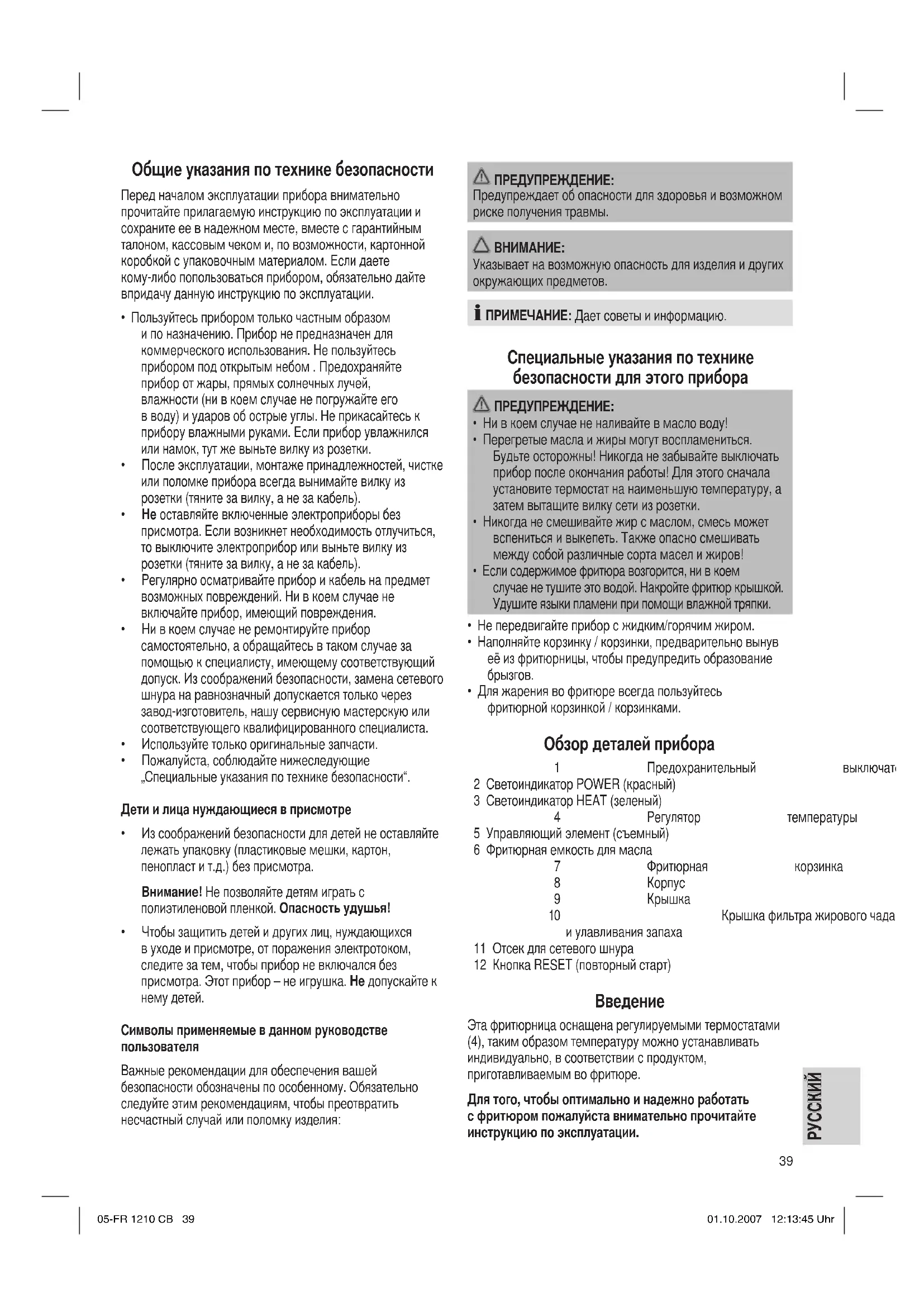 Эта фритюрница оснащена регулируемыми термостатами (4), таким образом температуру можно устанавливать индивидуально, в соответствии с продуктом, приготавливаемым во фритюре. Для того, чтобы оптимально и надежно работать с фритюром пожалуйста внимательно прочитайте инструкцию по эксплуатации. 05-FR 1210 CB 3905-FR 1210 CB 39 01.10.2007 12:13:45 Uhr01.10.2007 12:13:45 Uhr40