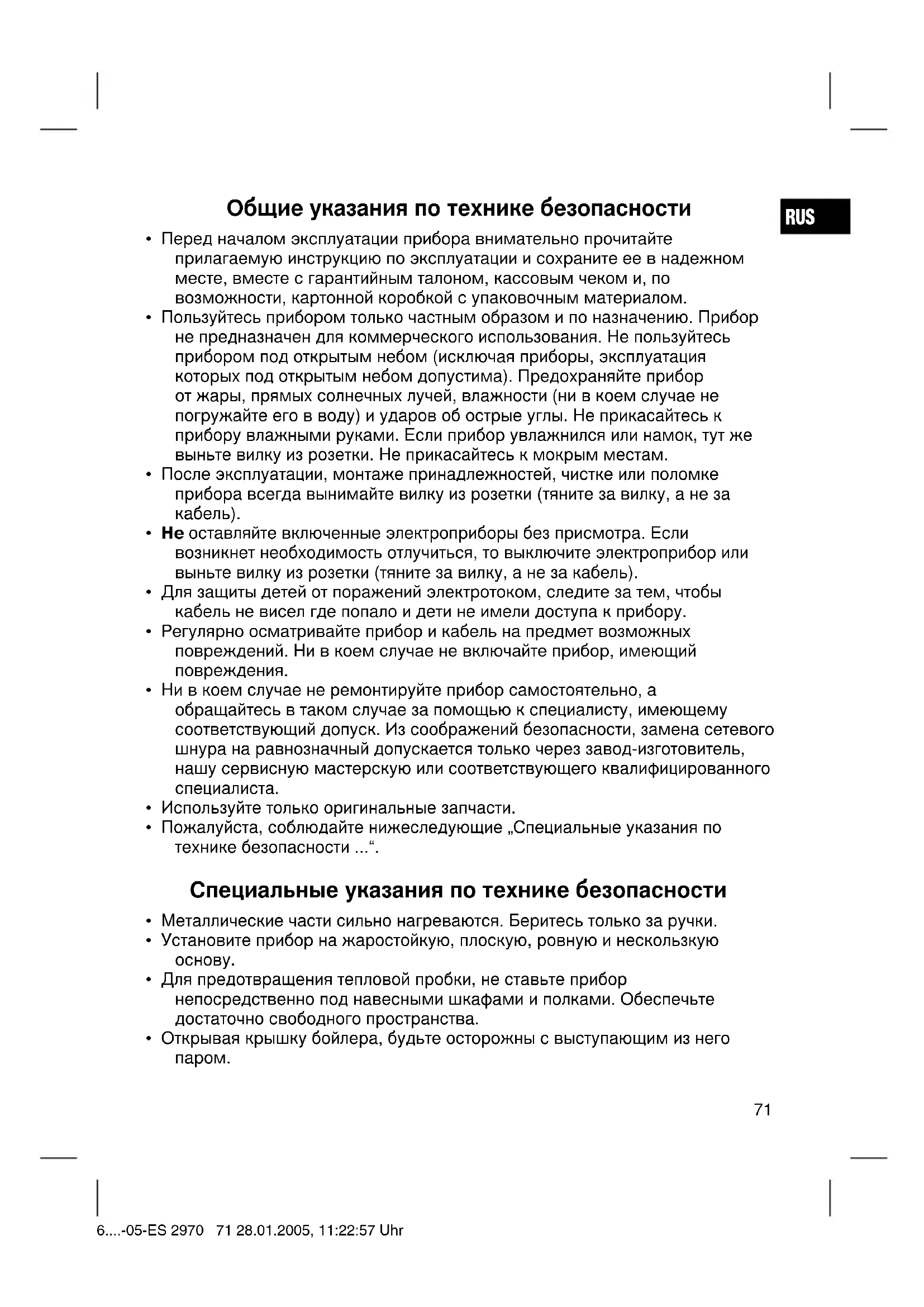 - Выньте вилку из розетки и дайте прибору остыть. 6....-05-ES 2970 75 28.01.2005, 11:23:01 UhrRUS