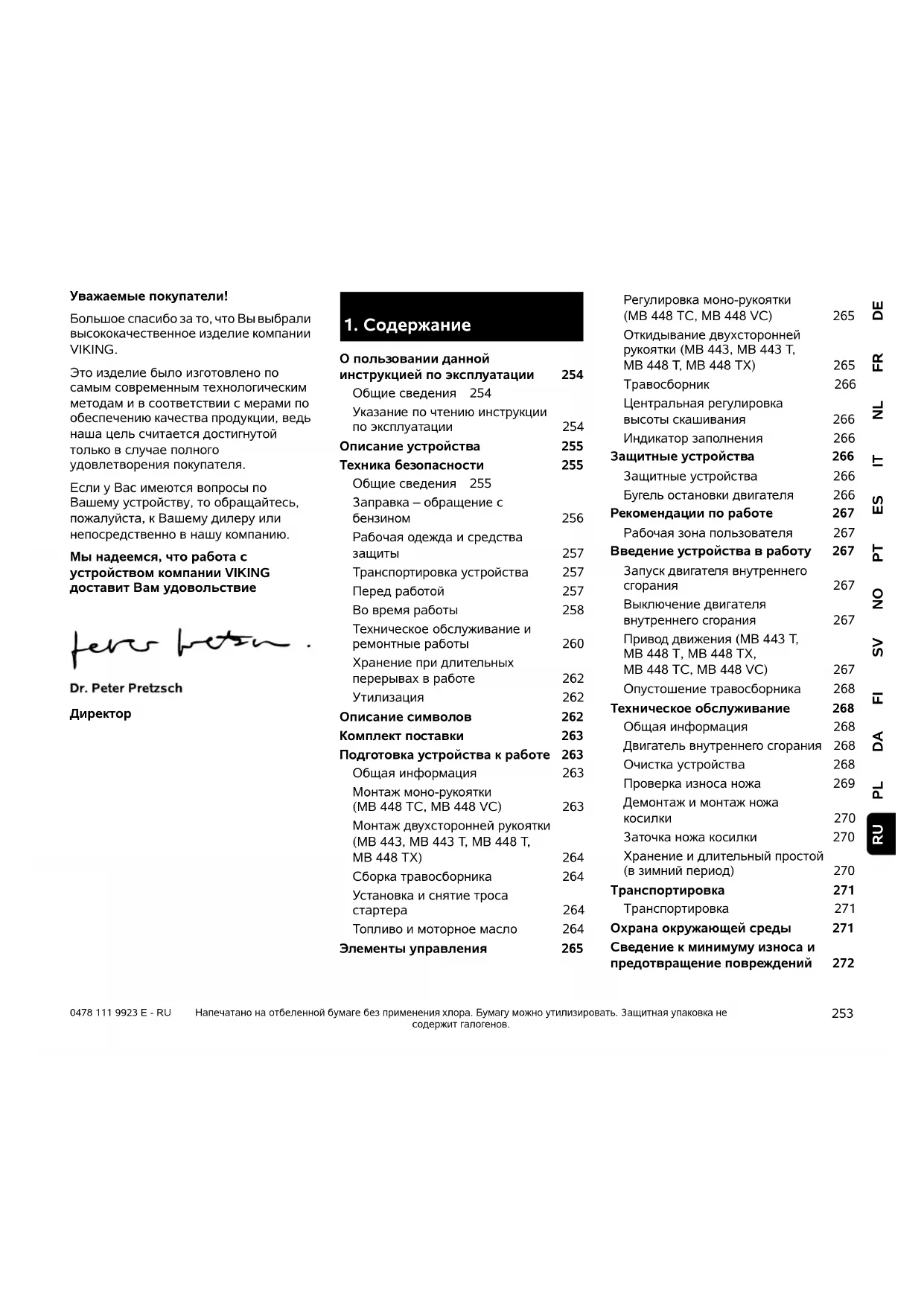 О пользовании данной инструкцией по эксплуатации 254 Общие сведения 254 Указание по чтению инструкции по эксплуатации 254 Описание устройства 255 Техника безопасности 255 Общие сведения 255 Заправка – обращение с бензином 256 Рабочая одежда и средства защиты 257 Транспортировка устройства 257 Перед работой 257 Во время работы 258 Техническое обслуживание и ремонтные работы 260 Хранение при длительных перерывах в работе 262 Утилизация 262 Описание символов 262 Комплект поставки 263 Подготовка устройства к работе 263 Общая информация 263 Монтаж моно-рукоятки (MB 448 TC, MB 448 VC) 263 Монтаж двухсторонней рукоятки (MB 443, MB 443 T, MB 448 T, MB 448 TX) 264 Сборка травосборника 264 Установка и снятие троса стартера 264 Топливо и моторное масло 264 Элементы управления 265 Регулировка моно-рукоятки (MB 448 TC, MB 448 VC) 265 Откидывание двухсторонней рукоятки (MB 443, MB 443 T, MB 448 T, MB 448 TX) 265 Травосборник 266 Центральная регулировка высоты скашивания 266 Индикатор заполнения 266 Защитные устройства 266 Защитные устройства 266 Бугель остановки двигателя 266 Рекомендации по работе 267 Рабочая зона пользователя 267 Введение устройства в работу 267 Запуск двигателя внутреннего сгорания 267 Выключение двигателя внутреннего сгорания 267 Привод движения (MB 443 T, MB 448 T, MB 448 TX, MB448TC, MB448VC) 267 Опустошение травосборника 268 Техническое обслуживание 268 Общая информация 268 Двигатель внутреннего сгорания 268 Очистка устройства 268 Проверка износа ножа 269 Демонтаж и монтаж ножа косилки 270 Заточка ножа косилки 270 Хранение и длительный простой (в зимний период)270 Транспортировка 271 Транспортировка 271 Охрана окружающей среды 271 Сведение к минимуму износа и предотвращение повреждений 2720478 111 9923 E - RU