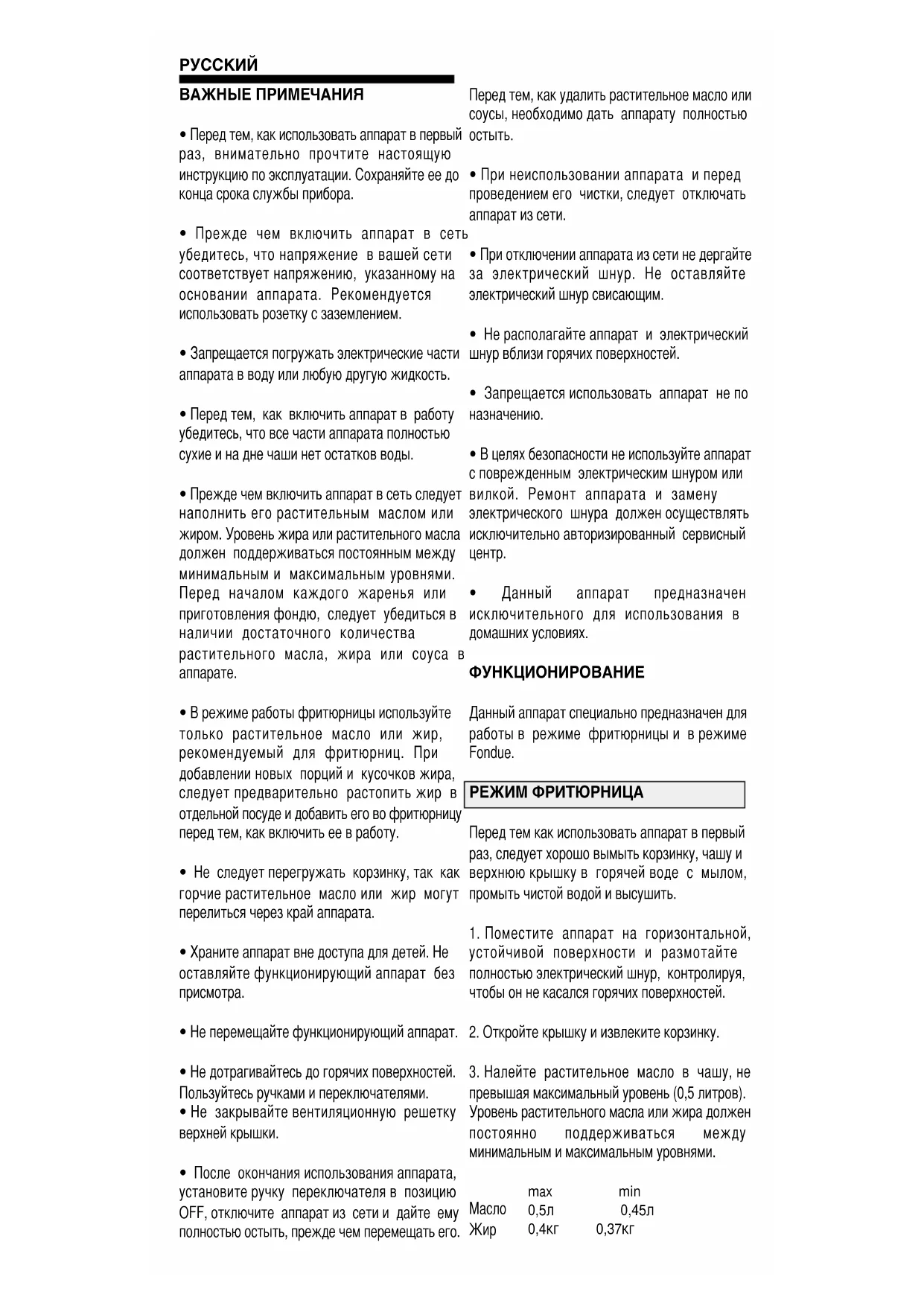 - Прежде чем включить аппарат в сеть следует наполнить его растительным маслом или жиром. Уровень жира или растительного масла должен поддерживаться постоянным между минимальным и максимальным уровнями. Перед началом каждого жаренья или приготовления фондю, следует убедиться в наличии достаточного количества растительного масла, жира или соуса в аппарате.