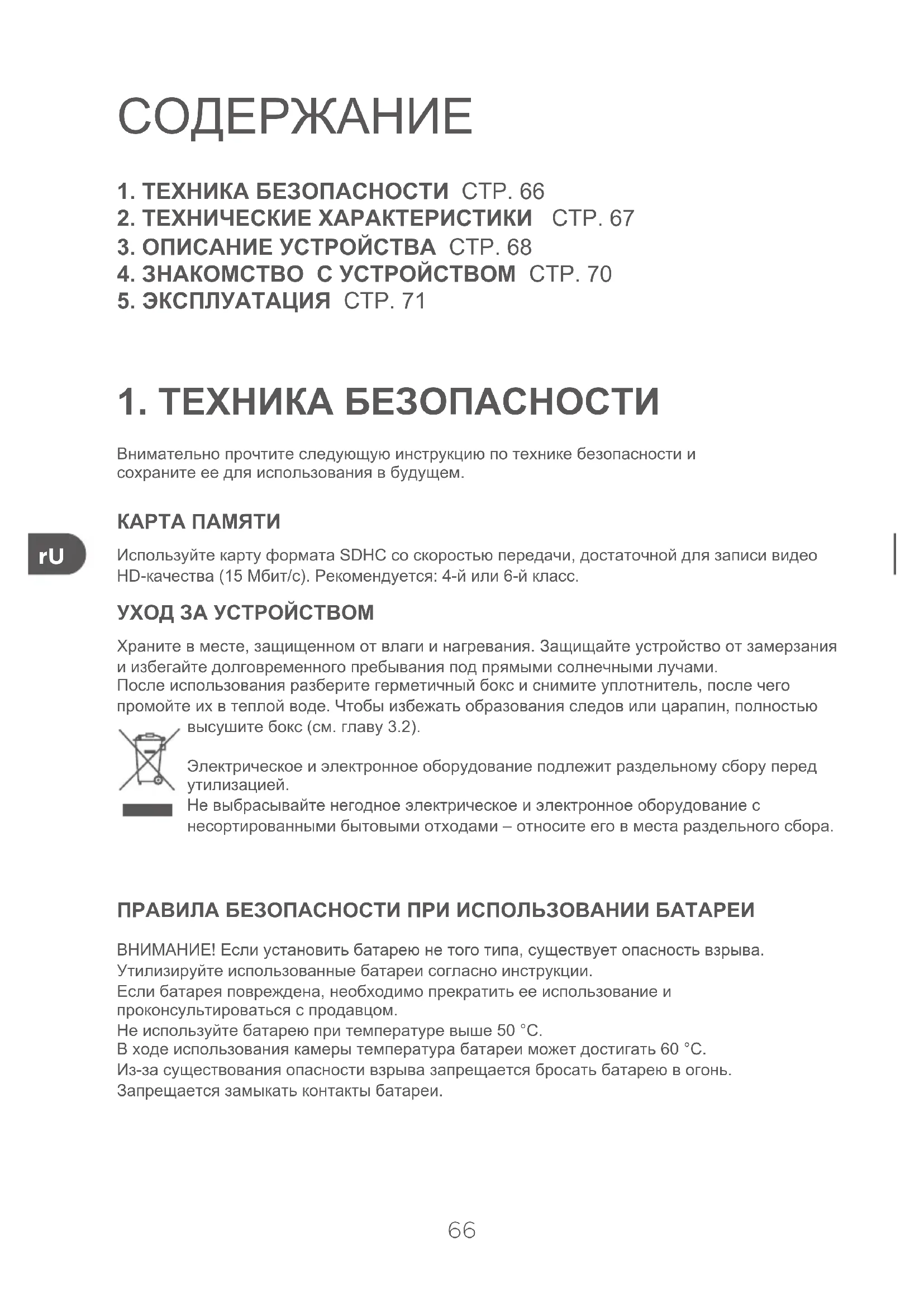 КАРТА ПАМЯТИ Используйте карту формата SDHC со скоростью передачи, достаточной для записи видео HD-качества (15 Мбит/с). Рекомендуется: 4-й или 6-й класс. УХОД ЗА УСТРОЙСТВОМ Храните в месте, защищенном от влаги и нагревания. Защищайте устройство от замерзания и избегайте долговременного пребывания под прямыми солнечными лучами. После использования разберите герметичный бокс и снимите уплотнитель, после чего промойте их в теплой воде. Чтобы избежать образования следов или царапин, полностью высушите бокс (см. главу 3.2). Электрическое и электронное оборудование подлежит раздельному сбору перед утилизацией. Не выбрасывайте негодное электрическое и электронное оборудование с несортированными бытовыми отходами – относите его в места раздельного сбора. ПРАВИЛА БЕЗОПАСНОСТИ ПРИ ИСПОЛЬЗОВАНИИ БАТАРЕИ ВНИМАНИЕ! Если установить батарею не того типа, существует опасность взрыва. Утилизируйте использованные батареи согласно инструкции. Если батарея повреждена, необходимо прекратить ее использование и проконсультироваться с продавцом. Не используйте батарею при температуре выше 50 °C.В ходе использования камеры температура батареи может достигать 60 °C. Из-за существования опасности взрыва запрещается бросать батарею в огонь. Запрещается замыкать контакты батареи.