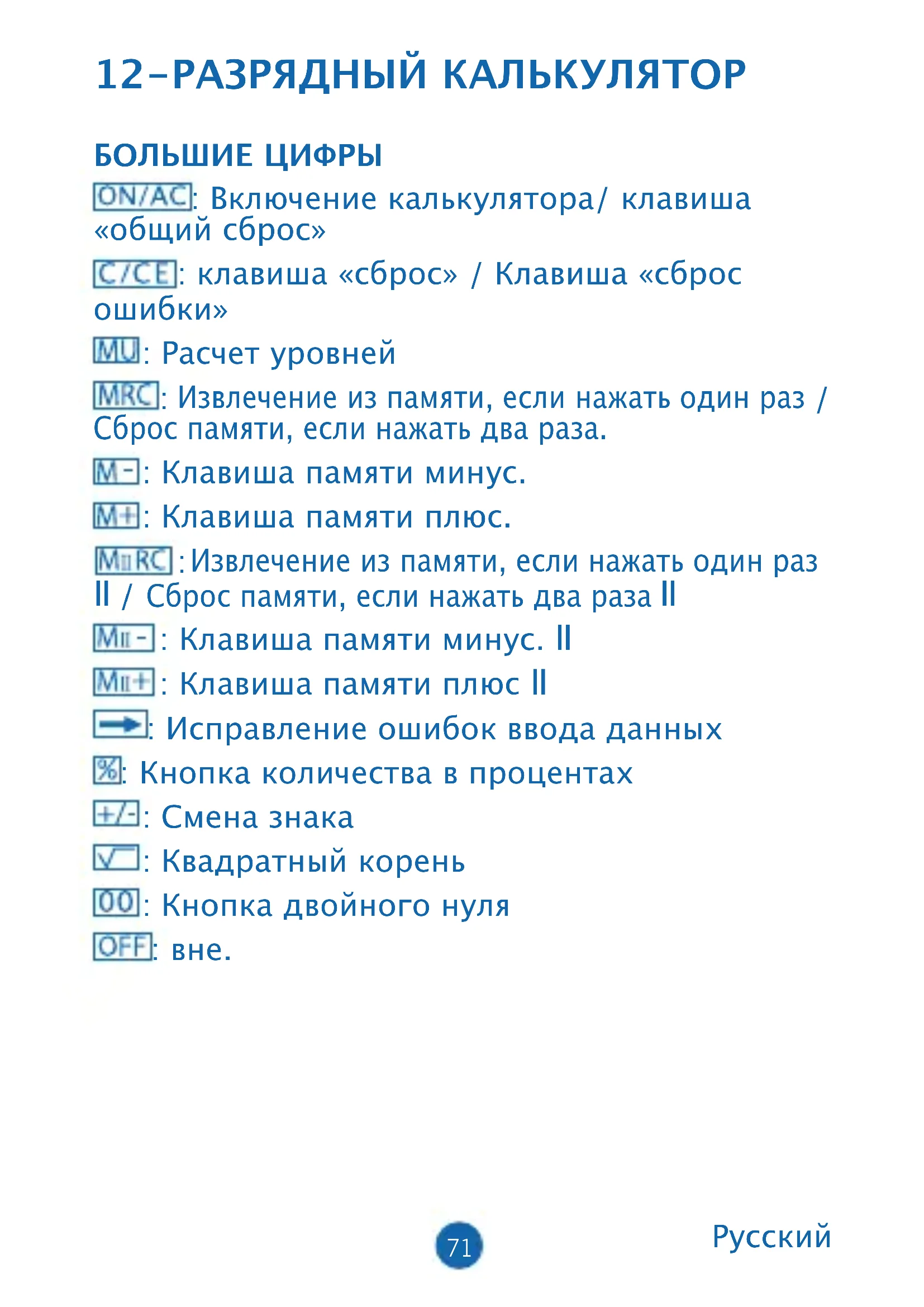 : Клавиша памяти минус. II : Клавиша памяти плюс II : Исправление ошибок ввода данных : Кнопка количества в процентах : Смена знака : Квадратный корень : Кнопка двойного нуля : вне.72 ОПИСАНИЕ ФУНКЦИЙ: