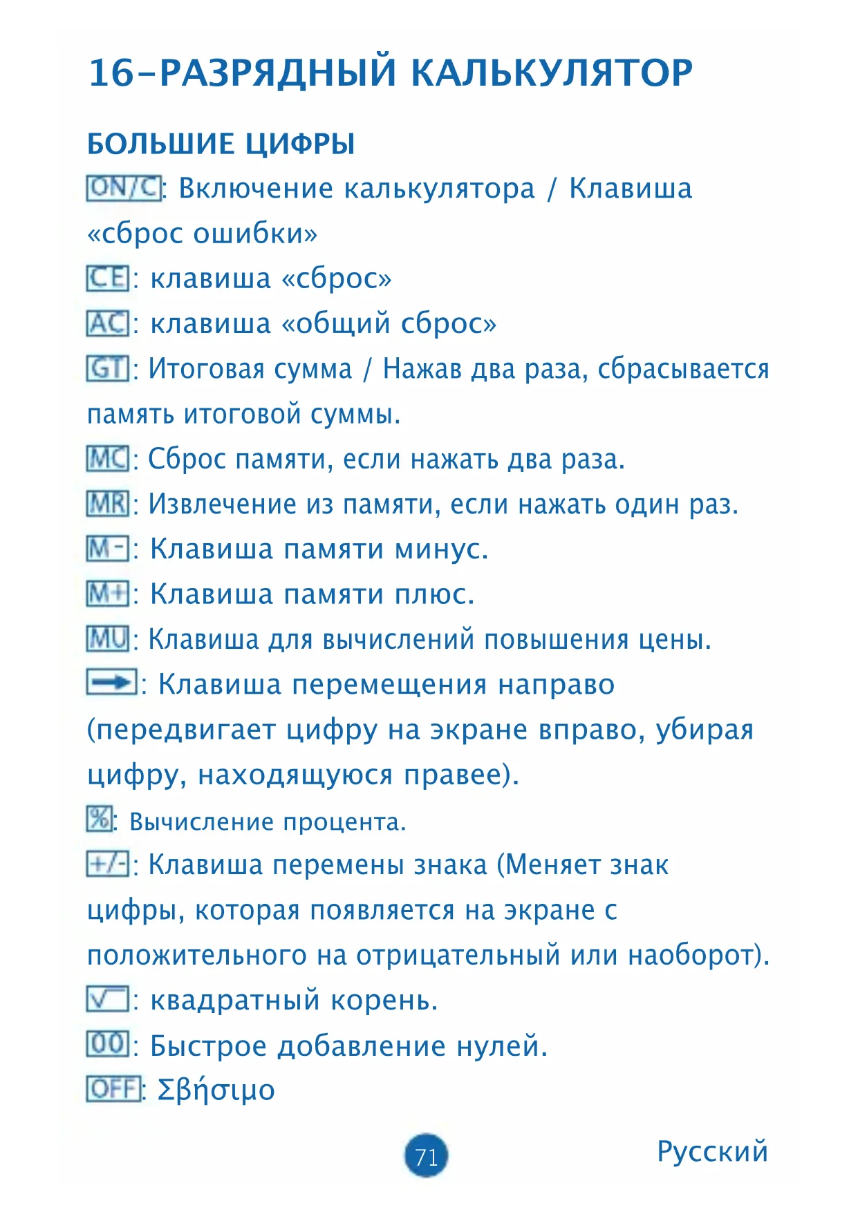 Клавиша перемены знака (Меняет знак цифры, которая появляется на экране с положительного на отрицательный или наоборот). : квадратный корень. : Быстрое добавление нулей. : Σβήσιμο72 ОПИСАНИЕ ФУНКЦИЙ: