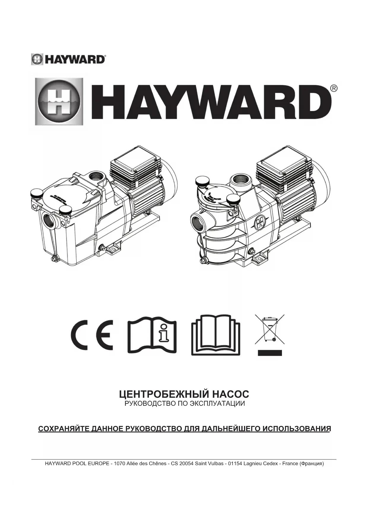 5. Att motorlagren inte skurit p.g.a. överdrivet spel, rost eller lång tids överhettning.HAYWARD POOL EUROPE - 1070 Allée des Chênes - CS 20054 Saint Vulbas - 01154 Lagnieu Cedex - France (Франция) СОХРАНЯЙТЕ ДАННОЕ РУКОВОДСТВО ДЛЯ ДАЛЬНЕЙШЕГО ИСПОЛЬЗОВАНИЯ ЦЕНТРОБЕЖНЫЙ НАСОС РУКОВОДСТВО ПО ЭКСПЛУАТАЦИИИСПОЛЬЗУЙТЕ ТОЛЬКО ОРИГИНАЛЬНЫЕ ЗАПЧАСТИ КОМПАНИИ «HAYWARD» Стр 2 из 7 Насос Ред. B ВНИМАНИЕ – Полностью отключите насос от источника питания перед обслуживанием самого насоса или фильтра. ВНИМАНИЕ – Все электрические соединения должны выполняться квалифицированным электриком в соответствии с местными электрическими стандартами.F NF C 15-100 GB BS7671:1992D DIN VDE 0100-702 EW EVHS-HD 384-7-702A ÖVE 8001-4-702 H MSZ 2364-702:1994 / MSZ 10-533 1/1990 E UNE 20460-7-702 1993, REBT ITC-BT-31 2002 M MSA HD 384-7-702.S2 IRL IS HD 384-7-702 PL PN-IEC 60364-7-702:1999