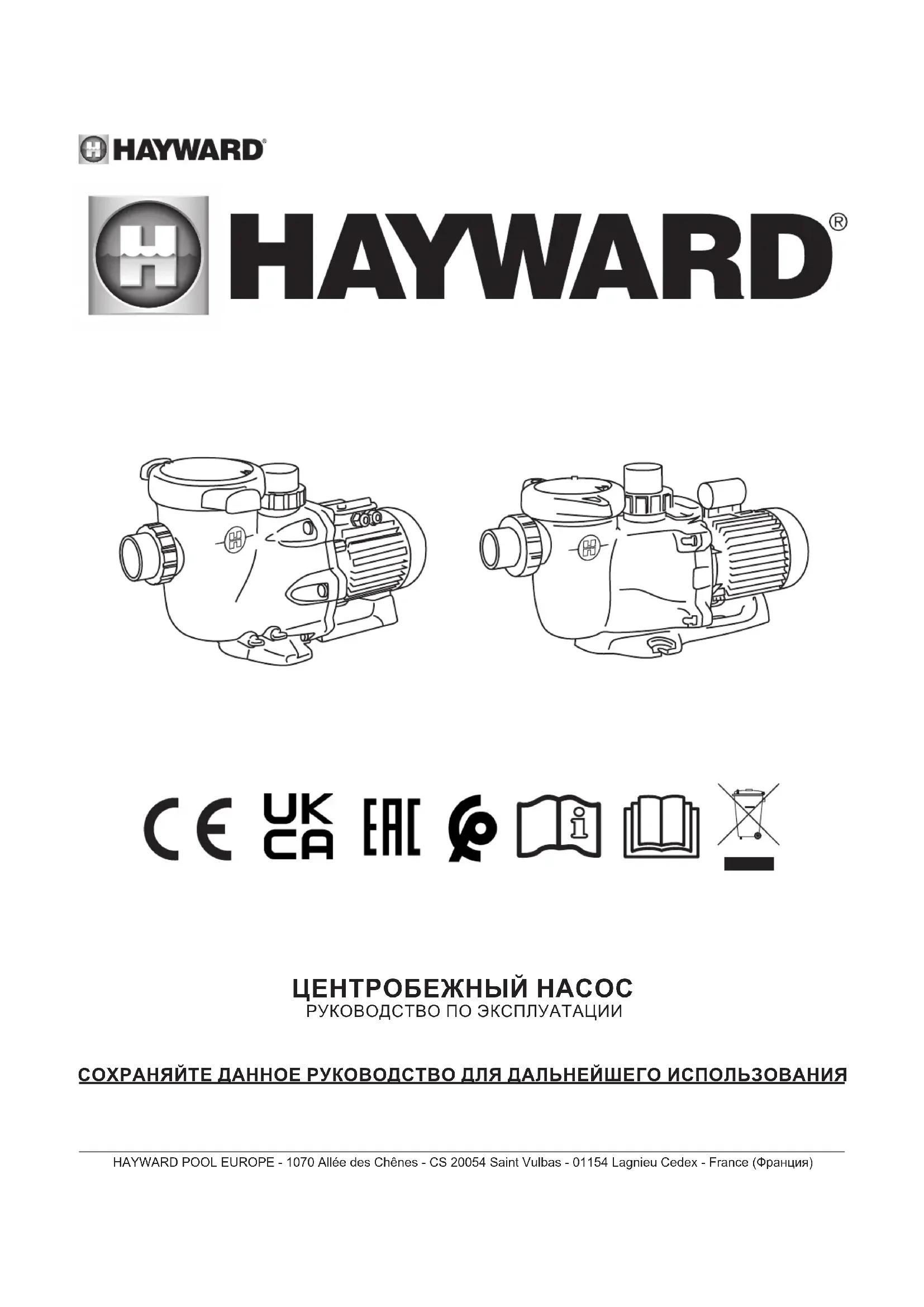 5. Att motorlagren inte skurit p.g.a. överdrivet spel, rost eller lång tids överhettning.HAYWARD POOL EUROPE - 1070 Allée des Chênes - CS 20054 Saint Vulbas - 01154 Lagnieu Cedex - France (Франция) СОХРАНЯЙТЕ ДАННОЕ РУКОВОДСТВО ДЛЯ ДАЛЬНЕЙШЕГО ИСПОЛЬЗОВАНИЯ ЦЕНТРОБЕЖНЫЙ НАСОС РУКОВОДСТВО ПО ЭКСПЛУАТАЦИИИСПОЛЬЗУЙТЕ ТОЛЬКО ОРИГИНАЛЬНЫЕ ЗАПЧАСТИ КОМПАНИИ «HAYWARD