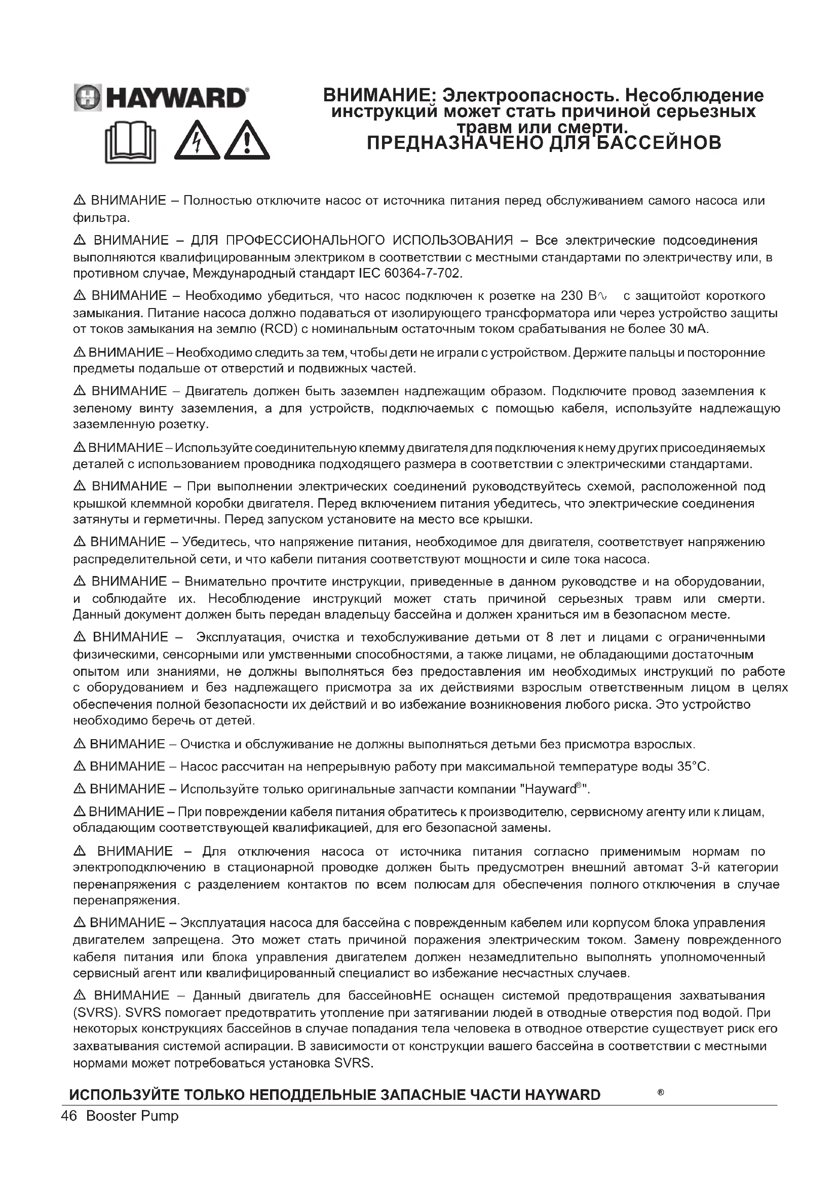 - ВНИМАНИЕ – Данный двигатель для бассейновНЕ оснащен системой предотвращения захватывания (SVRS). SVRS помогает предотвратить утопление при затягивании людей в отводные отверстия под водой. При некоторых конструкциях бассейнов в случае попадания тела человека в отводное отверстие существует риск его захватывания системой аспирации. В зависимости от конструкции вашего бассейна в соответствии с местными нормами может потребоваться установка SVRS. ВНИМАНИЕ: Электроопасность. Несоблюдение инструкций может стать причиной серьезных травм или смерти. ПРЕДНАЗНАЧЕНО ДЛЯ БАССЕЙНОВ c•ИСПОЛЬЗУЙТЕ ТОЛЬКО НЕПОДДЕЛЬНЫЕ ЗАПАСНЫЕ ЧАСТИ HAYWARD