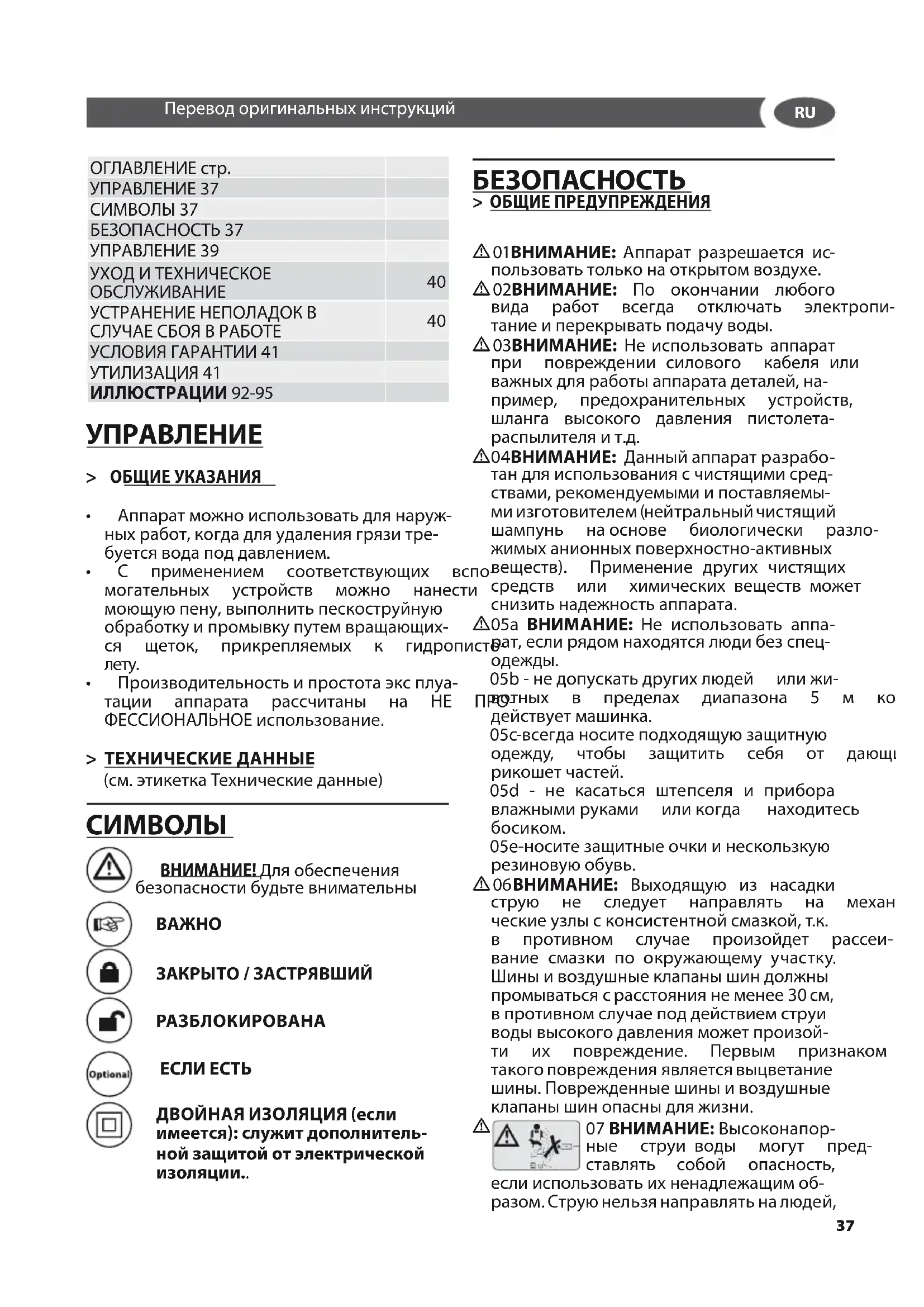 07 :Высоконапор- ные струи воды могут пред- ставлять собой опасность, еслииспользоватьихненадлежащимоб- разом.Струюнельзянаправлятьналюдей,RU