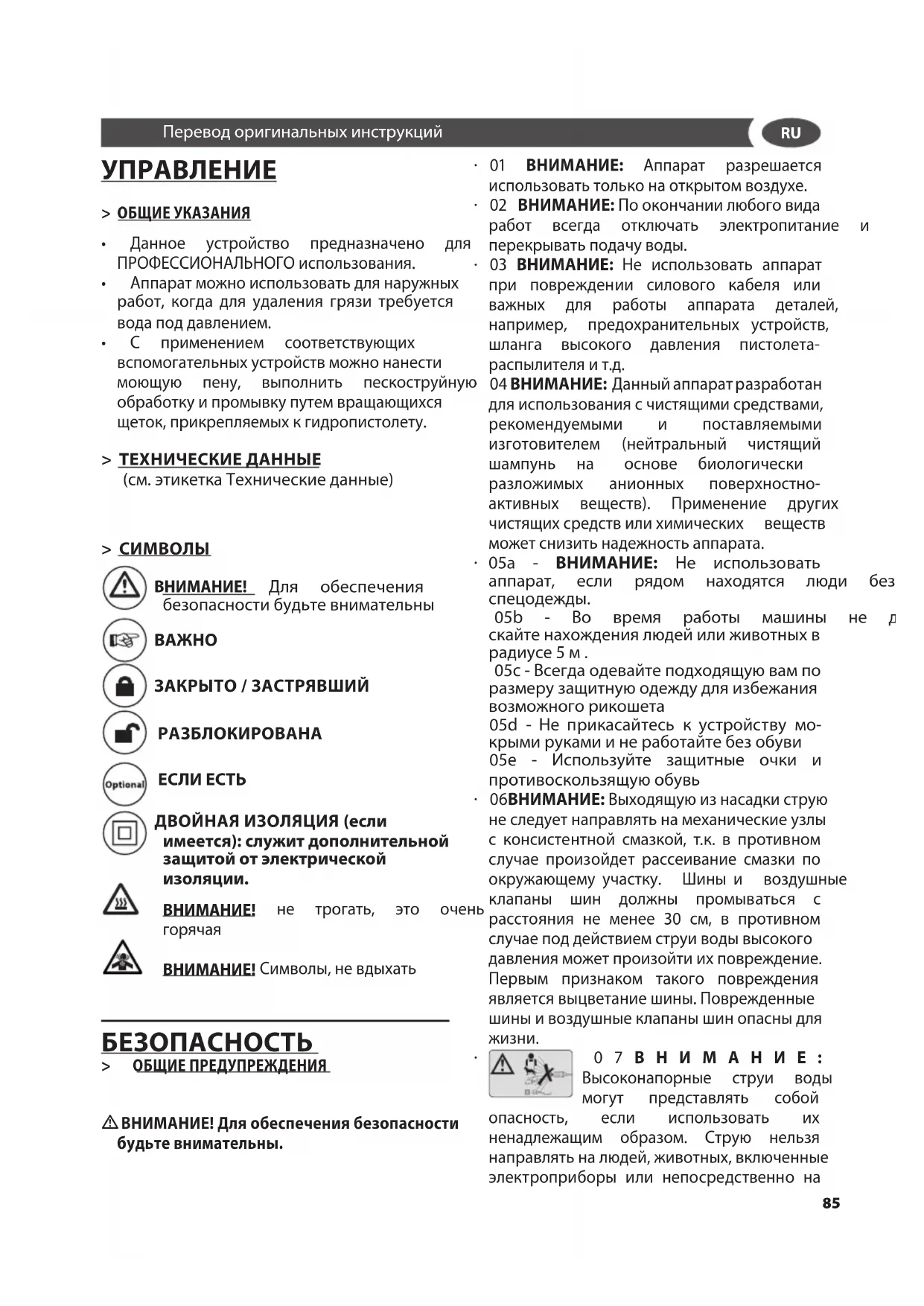 Высоконапорные струи воды могут представлять собой опасность, если использовать их ненадлежащим образом. Струю нельзя направлятьналюдей,животных,включенные электроприборы или непосредственно на Переводоригинальныхинструкций