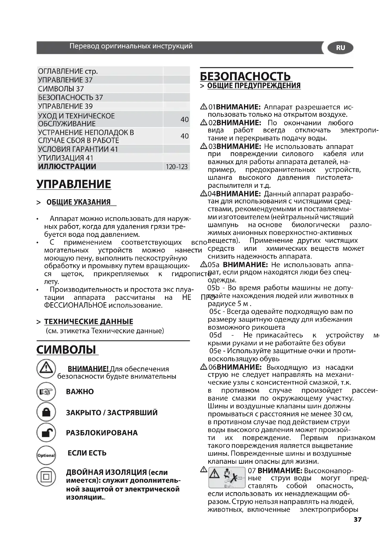 07 :Высоконапор- ные струи воды могут пред- ставлять собой опасность, еслииспользоватьихненадлежащимоб- разом.Струюнельзянаправлятьналюдей, животных, включенные электроприборыRU