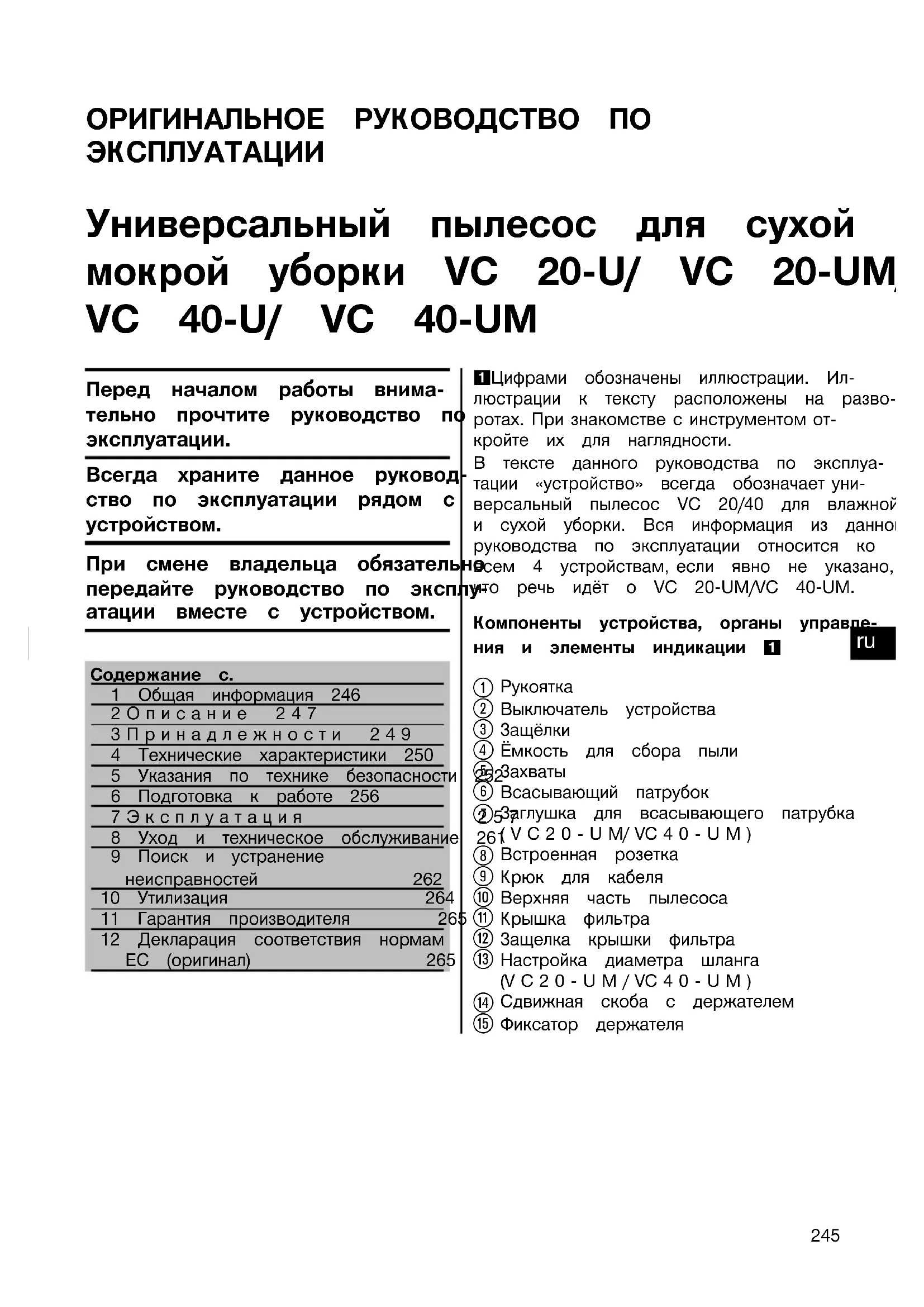 Printed: 08.07.2013 | Doc-Nr: PUB / 5071294 / 000 / 02ОРИГИНАЛЬНОЕ РУКОВОДСТВО ПО ЭКСПЛУАТАЦИИ Универсальный пылесос для сухой и мокрой уборки VC 20‑U/ VC 20‑UM/ VC 40‑U/ VC 40‑UM Перед началом работы внима- тельно прочтите руководство по эксплуатации. Всегда храните данное руковод- ство по эксплуатации рядом с устройством. При смене владельца обязательно передайте руководство по эксплу- атации вместе с устройством. Содержание с.1 Общая информация 2462Описание 2473Принадлежности 2494 Технические характеристики 2505 Указания по технике безопасности 2526 Подготовка к работе 2567Эксплуатация 2578 Уход и техническое обслуживание 2619 Поиск и устранениенеисправностей 26210 Утилизация 26411 Гарантия производителя 26512 Декларация соответствия нормамЕС (оригинал) 2651 Цифрами обозначены иллюстрации. Ил-люстрации к тексту расположены на разво- ротах. При знакомстве с инструментом от- кройте их для наглядности.В тексте данного руководства по эксплуа-тации «устройство» всегда обозначает уни-версальный пылесос VC 20/40 для влажнойи сухой уборки. Вся информация из данногоруководства по эксплуатации относится ковсем 4 устройствам, если явно не указано,что речь идёт о VC 20‑UM/VC 40‑UM.Компоненты устройства, органы управле-ния и элементы индикации 1