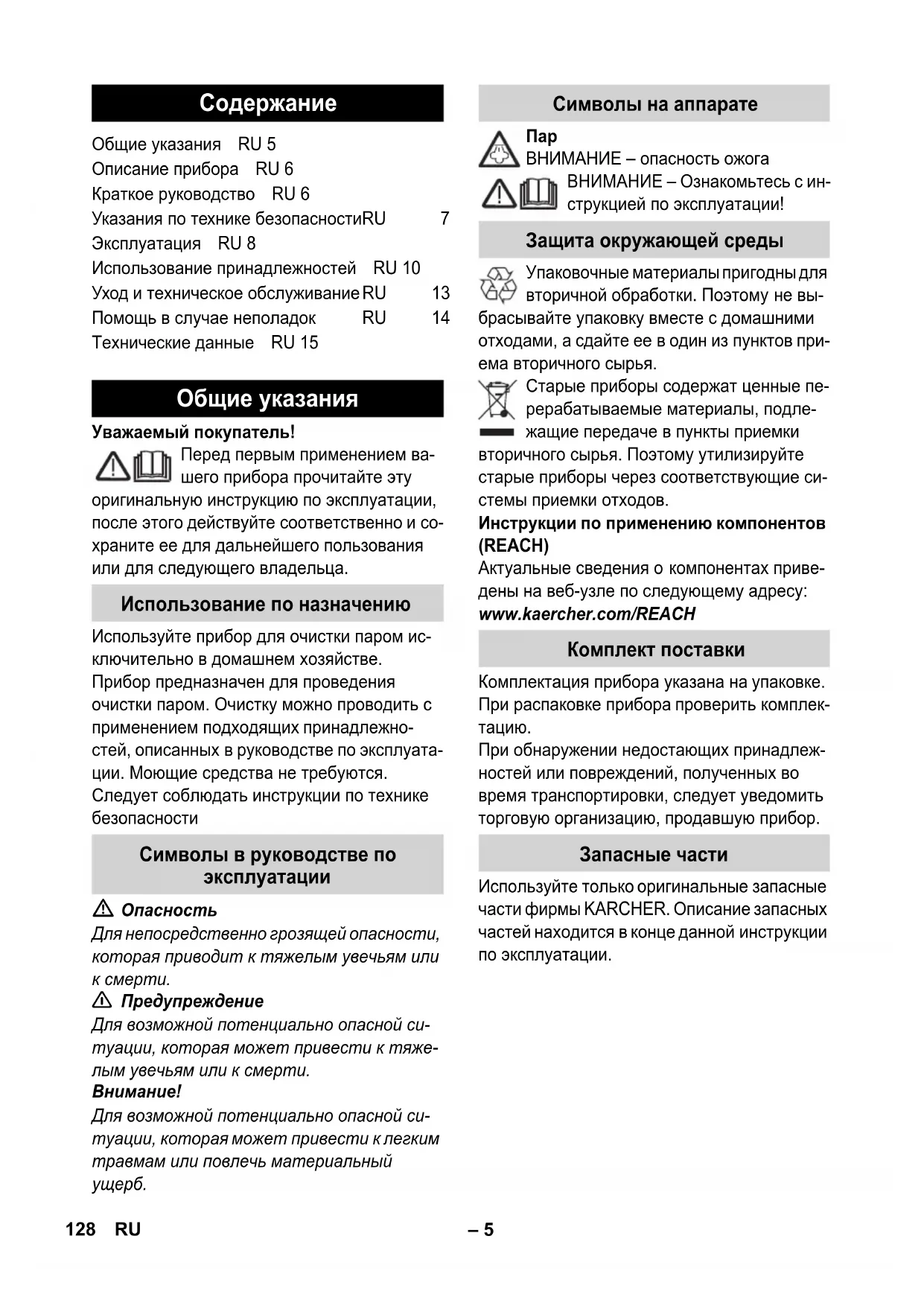 Общие указания RU 5 Описание прибора RU 6 Краткое руководство RU 6 Указания по технике безопасностиRU 7 Эксплуатация RU 8 Использование принадлежностей RU 10 Уход и техническое обслуживаниеRU 13 Помощь в случае неполадок RU 14 Технические данные RU 15 Общие указания Использование по назначению Символы в руководстве по эксплуатации Символы на аппарате Защита окружающей среды Комплект поставки Запасные части 128 RU– 6 В каждой стране действуют соответственно гарантийные условия, изданные уполномо- ченной организацией сбыта нашей продук- ции в данной стране. Возможные неисправности прибора в течение гарантий- ного срока мы устраняем бесплатно, если причина заключается в дефектах материа- лов или ошибках при изготовлении. В случае возникновения претензий в течение гаран- тийного срока просьба обращаться