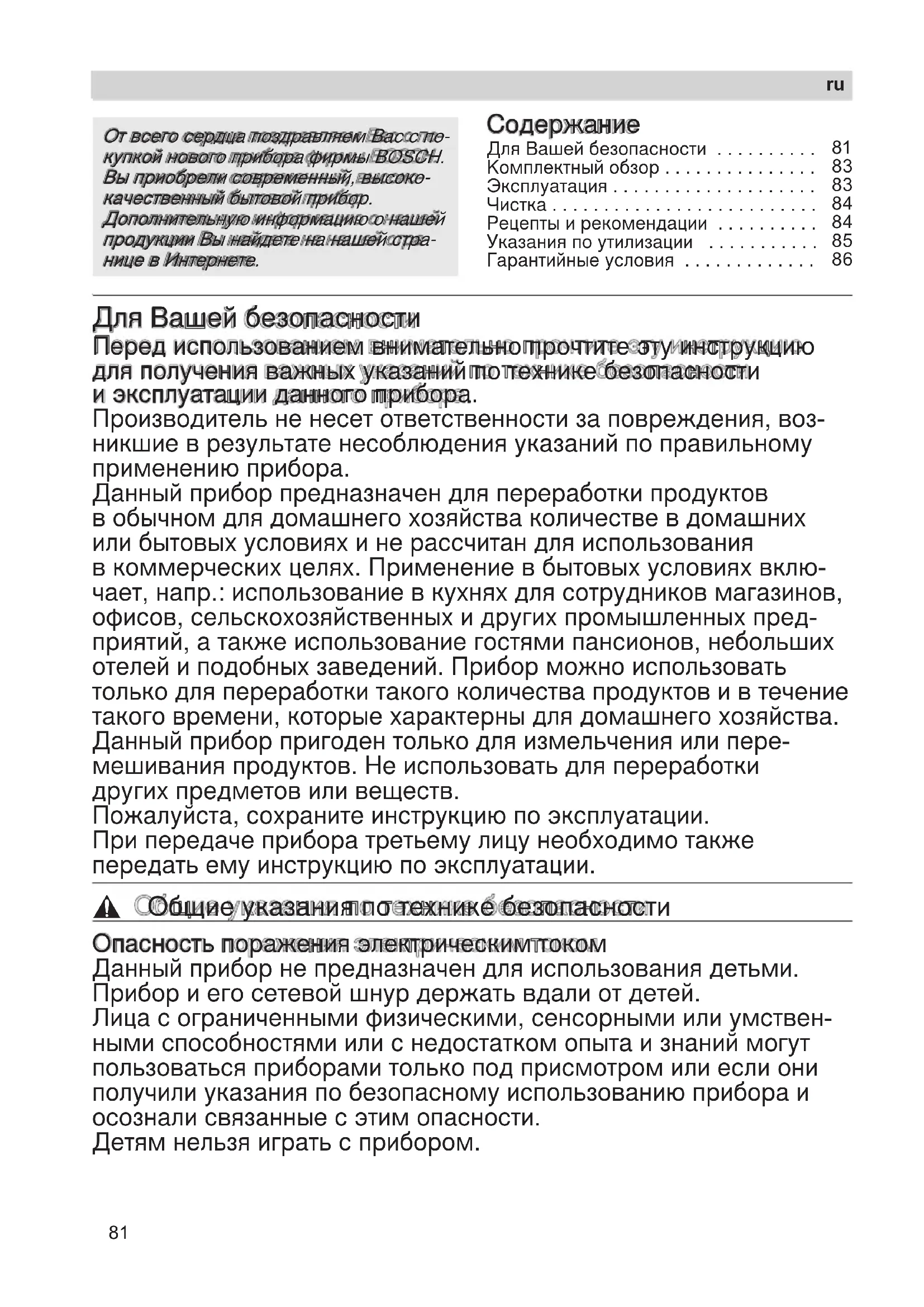 - Гарантийные условия Для Вашей безопасности Перед использованием внимательно прочтите эту инструкцию для получения важных указаний по технике безопасности и эксплуатации данного прибора. Производитель не несет ответственности за повреждения, воз- никшие в результате несоблюдения указаний по правильному применению прибора. Данный прибор предназначен для переработки продуктов в обычном для домашнего хозяйства количестве в домашних или бытовых условиях и не рассчитан для использования в коммерческих целях. Применение в бытовых условиях вклю- чает, напр.: использование в кухнях для сотрудников магазинов, офисов, сельскохозяйственных и других промышленных пред- приятий, а также использование гостями пансионов, небольших отелей и подобных заведений. Прибор можно использовать только для переработки такого количества продуктов и в течение такого времени, которые характерны для домашнего хозяйства. Данный прибор пригоден только для измельчения или пере- мешивания продуктов. Hе использовать для переработки других предметов или веществ. Пожалуйста, сохраните инструкцию по эксплуатации. При передаче прибора третьему лицу необходимо также передать ему инструкцию по эксплуатации. , Общие указания по технике безопасности Опасность поражения электрическим током Данный прибор не предназначен для использования детьми. Прибор и его сетевой шнур держать вдали от детей. Лица с ограниченными физическими, сенсорными или умствен- ными способностями или с недостатком опыта и знаний могут пользоваться приборами только под присмотром или если они получили указания по безопасному использованию прибора и осознали связанные с этим опасности. Детям нельзя играть с прибором. p. 91