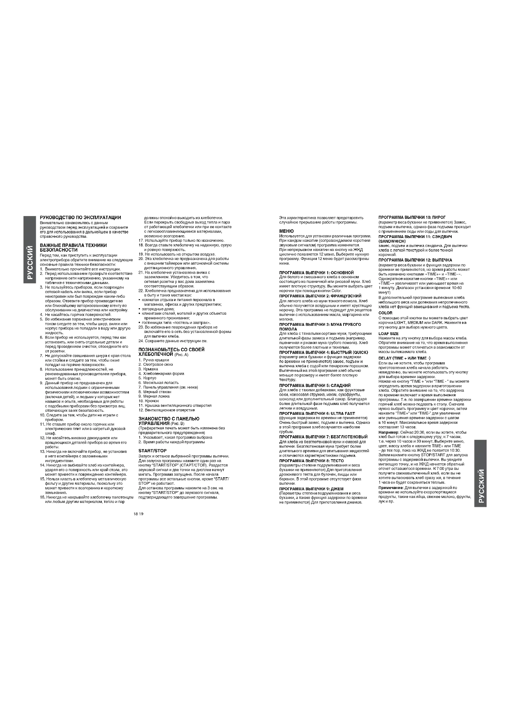 В дополнительной программе выпекания хлеба небольшого веса или допекания непропеченного хлеба нет функций замешивания и подъема теста. COLOR С помощью этой кнопки вы можете выбрать цвет корочки LIGHT, MEDIUM или DARK. Нажмите на эту кнопку для выбора нужного цвета. LOAF SIZE Нажмите на эту кнопку для выбора массы хлеба. Обратите внимание на то, что время выполнения программы может отличаться в зависимости от массы выпекаемого хлеба. DELAY (TIME + ИЛИ TIME -) Если вы не хотите, чтобы программа приготовления хлеба начала работать немедленно, вы можете использовать эту кнопку для выбора времени задержки. Нажав на кнопку “TIME + ”или “TIME - ” вы можете определить время задержки в приготовлении хлеба. Обратите внимание на то, что задержка по времени включает и время выполнения программы. Т.е. по завершении времени задержки горячий хлеб можно подавать к столу. Сначала нужно выбрать программу и цвет корочки, затем нажмите “TIME+” или “TIME-” для увеличения или уменьшения времени задержки с шагом в 10 минут. Максимальное время задержки составляет 13 часов. Например: Сейчас 20:30, если вы хотите, чтобы хлеб был готов к следующему утру, к 7 часам, т.е. через 10 часов и 30 минут. Выберите меню, цвет, массу хлеба и нажмите TIME+ или TIME – до тех пор, пока на ЖКД не появится 10:30. Затем нажмите кнопку STOP/START для запуска программы с задержкой выпечки. Вы увидите мигающую точку, и на ЖКД начнется обратный отсчет оставшегося времени. К 7:00 утра вы получите свежевыпеченный хлеб, если вы не хотите вытаскивать хлеб сразу же, в течение 1 часа он будет сохраняться теплым. Примечание: Для выпечки с задержкой по времени не используйте скоропортящиеся продукты, такие как яйца, свежее молоко, фрукты, лук и пр.21 RUSSKIJ