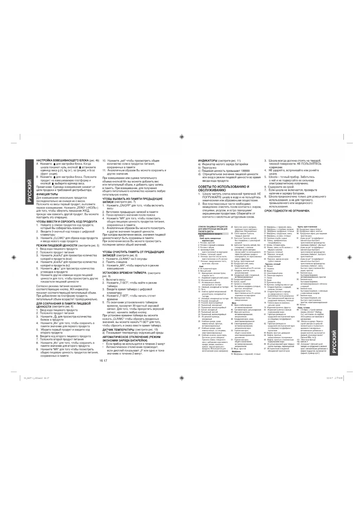 - Автоматическое отключение происходит, если дисплей показывает „0“ или одно и тоже значение в течение 2 минут. RUSSKIj ИНДИКАТОРЫ (смотрите рис. 11) a) Индикатор малого заряда батарейки b) Перегрузка c) Пищевая ценность превышает 199999 d) Отрицательное значение пищевой ценности или вход в режим пищевой ценности во время ввода кода продукта СОВЕТЫ ПО ИСПОЛЬЗОВАНИЮ И ОБСЛУЖИВАНИЮ
