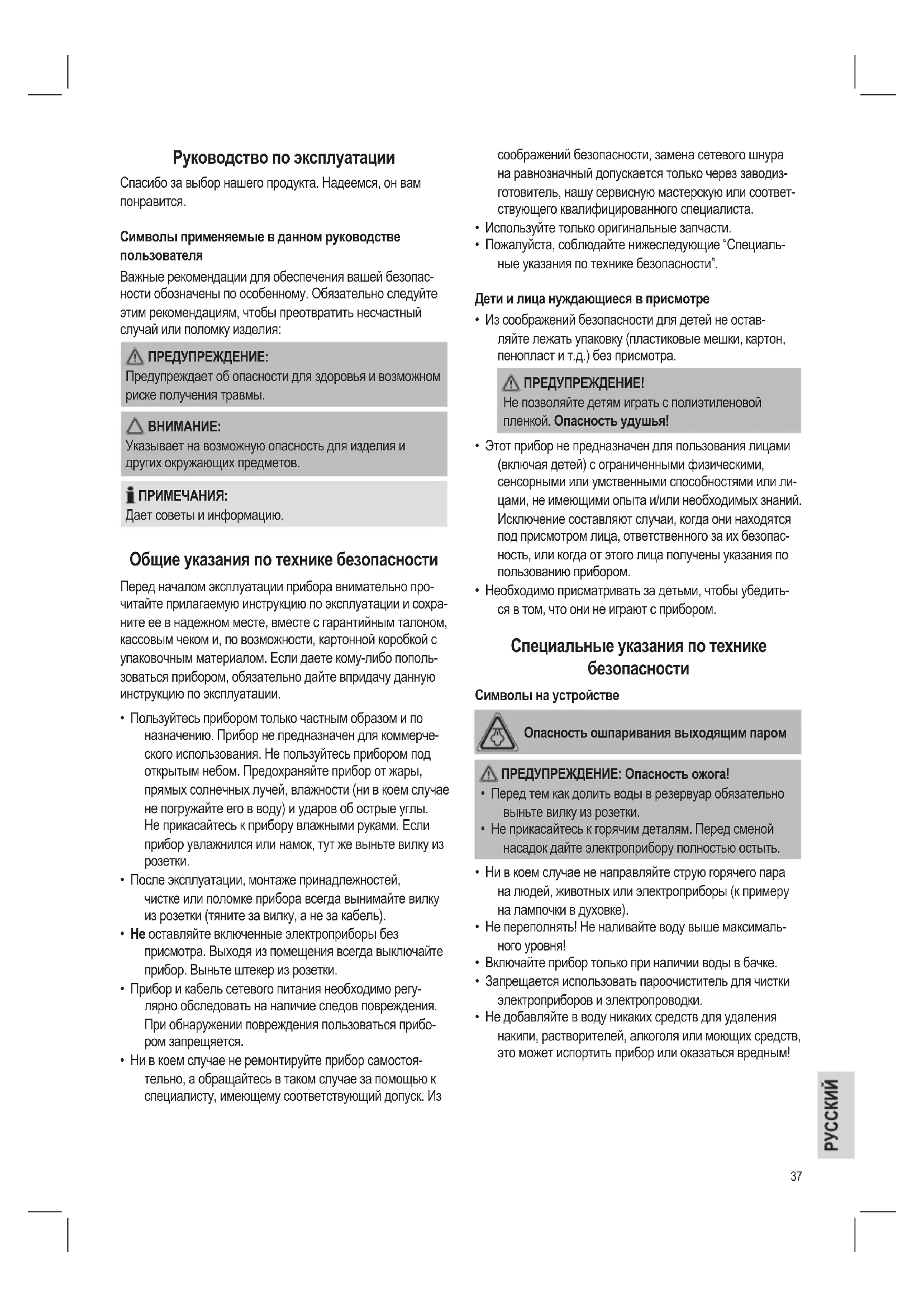 - Необходимо присматривать за детьми, чтобы убедить- ся в том, что они не играют с прибором. Специальные указания по технике безопасности Символы на устройстве Опасность ошпаривания выходящим паром ПРЕДУПРЕЖДЕНИЕ: Опасность ожога!