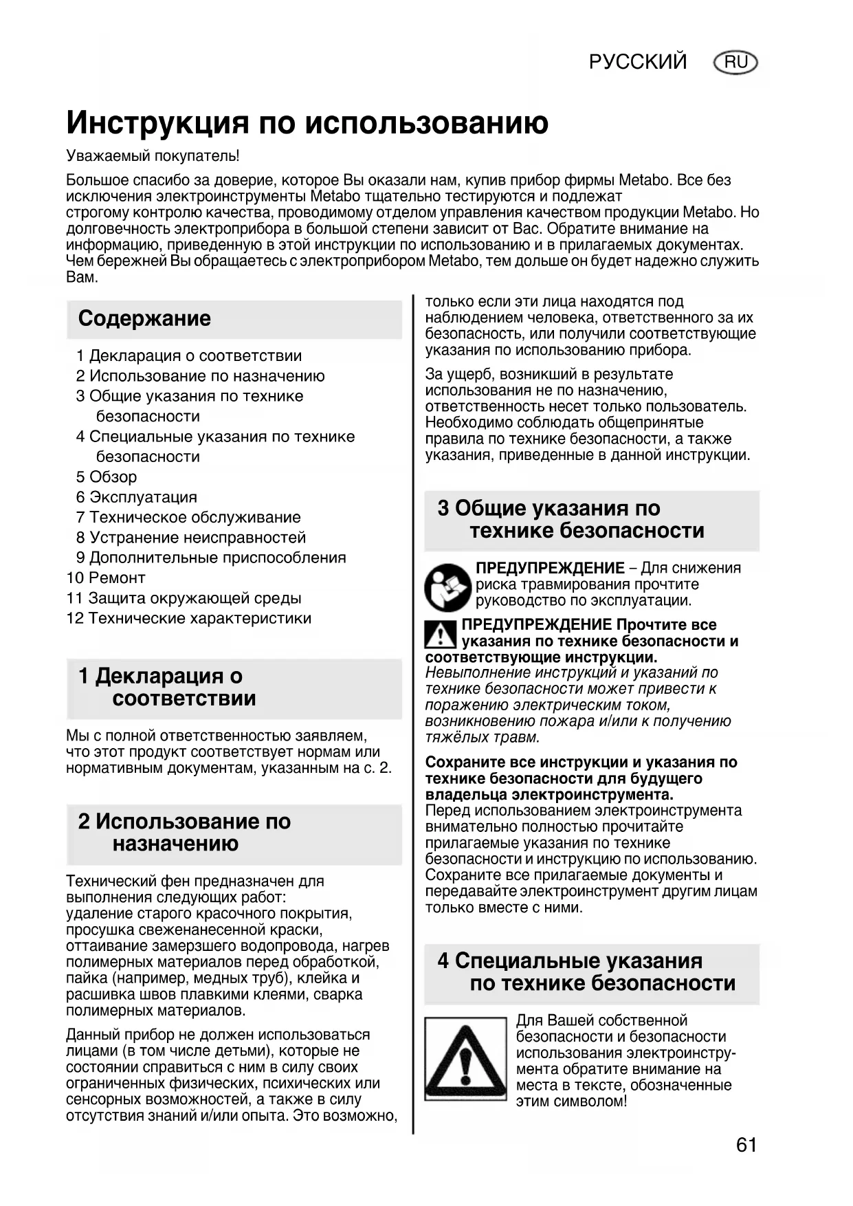 1 Декларация о соответствии 2 Использование по назначению 3 Общие указания по технике безопасности 4 Специальные указания по технике безопасности 5 Обзор 6 Эксплуатация 7 Техническое обслуживание 8 Устранение неисправностей 9 Дополнительные приспособления 10 Ремонт 11 Защита окружающей среды 12 Технические характеристики Мы с полной ответственностью заявляем, что этот продукт соответствует нормам или нормативным документам, указанным на с. 2. Технический фен предназначен для выполнения следующих работ: удаление старого красочного покрытия, просушка свеженанесенной краски, оттаивание замерзшего водопровода, нагрев полимерных материалов перед обработкой, пайка (например, медных труб), клейка и расшивка швов плавкими клеями, сварка полимерных материалов. Данный прибор не должен использоваться лицами (в том числе детьми), которые не состоянии справиться с ним в силу своих ограниченных физических, психических или сенсорных возможностей, а также в силу отсутствия знаний и/или опыта. Это возможно, только если эти лица находятся под наблюдением человека, ответственного за их безопасность, или получили соответствующие указания по использованию прибора. За ущерб, возникший в результате использования не по назначению, ответственность несет только пользователь. Необходимо соблюдать общепринятые правила по технике безопасности, а также указания, приведенные в данной инструкции. ПРЕДУПРЕЖДЕНИЕ – Для снижения риска травмирования прочтите руководство по эксплуатации. ПРЕДУПРЕЖДЕНИЕ Прочтите все указания по технике безопасности и соответствующие инструкции. Невыполнение инструкций и указаний по технике безопасности может привести к поражению электрическим током, возникновению пожара и/или к получению тяжёлых травм. Сохраните все инструкции и указания по технике безопасности для будущего владельца электроинструмента. Перед использованием электроинструмента внимательно полностью прочитайте прилагаемые указания по технике безопасности и инструкцию по использованию. Сохраните все прилагаемые документы и передавайте электроинструмент другим лицам только вместе с ними. Для Вашей собственной безопасности и безопасности использования электроинстру- мента обратите внимание на места в тексте, обозначенные этим символом! Инструкция по использованию Уважаемый покупатель! Большое спасибо за доверие, которое Вы оказали нам, купив прибор фирмы Metabo. Все без исключения электроинструменты Metabo тщательно тестируются и подлежат строгому контролю качества, проводимому отделом управления качеством продукции Metabo. Но долговечность электроприбора в большой степени зависит от Вас. Обратите внимание на информацию, приведенную в этой инструкции по использованию и в прилагаемых документах. Чем бережней Вы обращаетесь с электроприбором Metabo, тем дольше он будет надежно служить